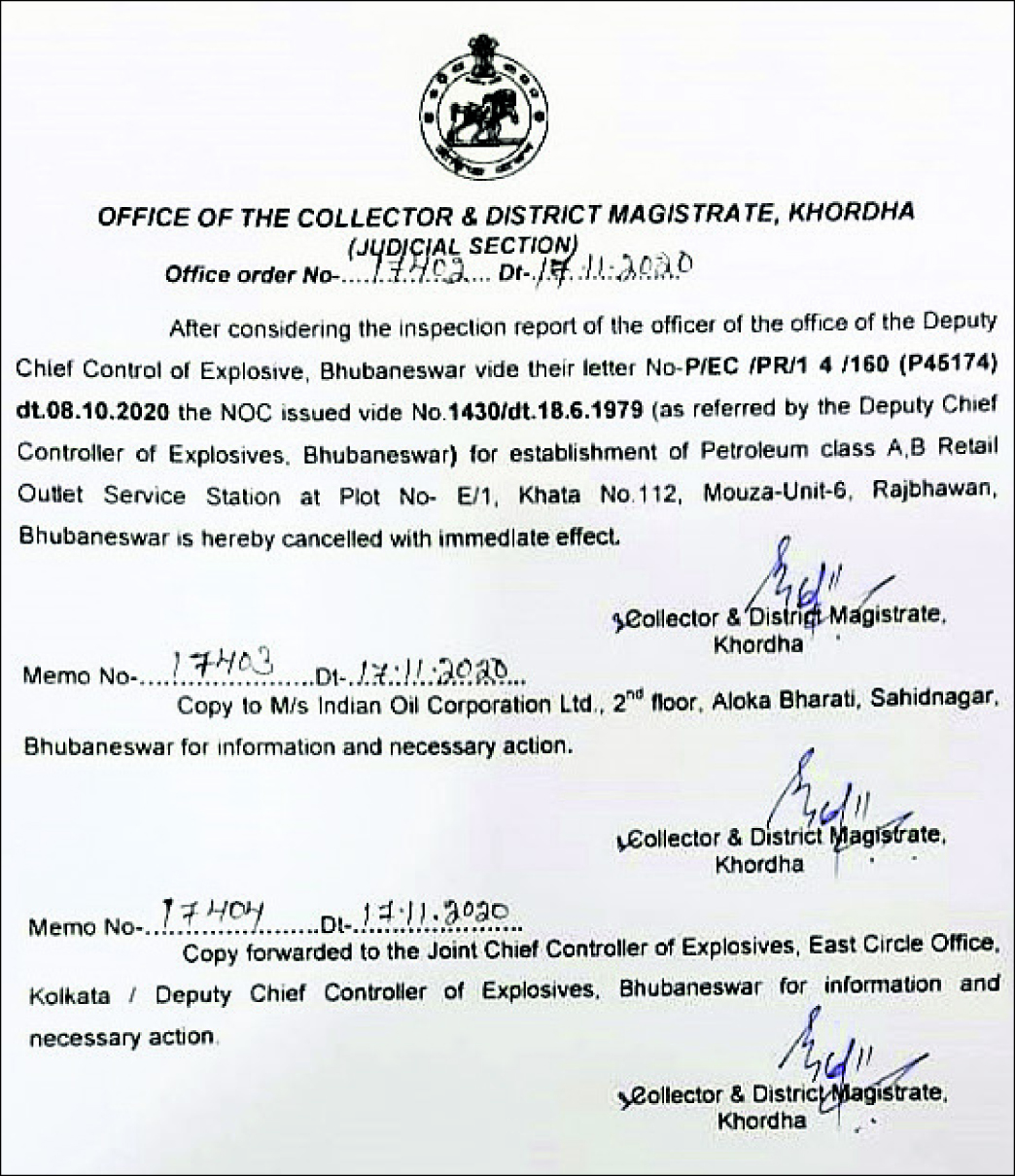 ଭୁବନେଶ୍ୱର,୨୬ା୧୧:ଭୁବନେଶ୍ୱର ରାଜଭବନ ନିକଟ ପେଟ୍ରୋଲ ପମ୍ପ୍ରେ ଗତ ଅକ୍ଟୋବର ୭ ତାରିଖରେ ଘଟିଥିବା ଭୟଙ୍କର ବିସ୍ଫୋରଣ ଘଟଣାରେ ସରକାରଙ୍କ ପକ୍ଷରୁ କାର୍ଯ୍ୟାନୁଷ୍ଠାନ ସ୍ବରୂପ ଏହାର ଅନୁମତି ବାତିଲ କରିଦିଆଯାଇଛି। ଏ ସଂକ୍ରାନ୍ତରେ ନଭେମ୍ବର ୧୭ରେ ଖୋର୍ଦ୍ଧା ଜିଲାପାଳଙ୍କ କାର୍ଯ୍ୟାଳୟ ପକ୍ଷରୁ ଅଫିସ୍ ଅର୍ଡର ନଂ. ୧୭୪୦୨ ଅନୁଯାୟୀ ଏଭଳି ପଦକ୍ଷେପ ନିଆଯାଇଛି। ବିସ୍ଫୋରଣ ଘଟିବା ପରେ ଅକ୍ଟୋବର ୮ରେ ଭୁବନେଶ୍ୱରସ୍ଥିତ ଡେପୁଟି ଚିଫ୍ କଣ୍ଟ୍ରୋଲ ଅଫ୍ ଏକ୍ସପ୍ଲୋସିଭ୍ର ଅଧିକାରୀଙ୍କ ତଦନ୍ତ ରିପୋର୍ଟ ଆଧାରରେ ଚିଠି ନଂ. P/EC/PR/1 4/160 (P45174)ରେ କାର୍ଯ୍ୟାନୁଷ୍ଠାନ ଗ୍ରହଣ କରାଯାଇଛି। ସୂଚନାଯୋଗ୍ୟ, ୟୁନିଟ୍ ୬ ମୌଜାର ଖାତା ନଂ. ୧୧୨, ପ୍ଲଟ ନଂ. ଇ/୧ରେ ଏ.ବି. ରିଟେଲ ଆଉଟଲେଟ୍ ସର୍ଭିସ୍ ଷ୍ଟେଶନ ସ୍ଥାପନ ଲାଗି ପତ୍ରସଂଖ୍ୟା ୧୪୩୦/ ୧୮ା୬ା୧୯୭୯ରେ ଏନ୍ଓସି ପ୍ରଦାନ କରାଯାଇଥିଲା।