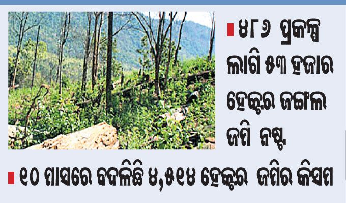 ଜଙ୍ଗଲ ଓ ପରିବେଶ ବିଭାଗ ସୂତ୍ରରୁ ମିଳିଥିବା ସୂଚନା ଅନୁଯାୟୀ କେନ୍ଦ୍ର ସରକାର ୨୦୧୯ ଜାନୁୟାରୀ ୩୧ ପର୍ଯ୍ୟନ୍ତ ୪୮୬ଟି ପ୍ରକଳ୍ପ ପାଇଁ ରାଜ୍ୟର ୫୩,୩୯୫.୬୦ ହେକ୍ଟର ଜଙ୍ଗଲ ଜମିକୁ ଅଣଜଙ୍ଗଲ କିସମରେ ପରିଣତ କରିବାକୁ ଅନୁମତି ଦେଇଛନ୍ତି । ୮୪ଟି ଜଳସେଚନ ପ୍ରକଳ୍ପ ନିମନ୍ତେ ୯୭୭୭.୪୬ ହେକ୍ଟର ଜଙ୍ଗଲ ଜମିକୁ ବଦଳାଯାଇ ଥିବା ବେଳେ ୨୮ ଶିଳ୍ପ ପାଇଁ ୪୩୦୪.୪୯, ୧୮୭ ଖଣି ପାଇଁ ୨୭୨୫୯.୯୩, ୬ ଶକ୍ତି ପ୍ରକଳ୍ପ ଲାଗି ୧୧୬.୪୫, ୪୧ ରାସ୍ତା ଓ ପୋଲ ନିର୍ମାଣ ପାଇଁ ୪୬୬.୪୯, ୧୯ ରେଳ ପ୍ରକଳ୍ପ ପାଇଁ ୨୪୧୭.୫୯, ୪ଟି ପ୍ରତିରକ୍ଷା ପ୍ରକଳ୍ପ ଲାଗି ୩୮୬୫.୨୫, ୩ ବିସ୍ଥାପନ ପ୍ରକଳ୍ପ ନିମନ୍ତେ ଆବାସ ନିର୍ମାଣ ସକାଶେ ୩୨୧.୯୪, ୬୬ଟି ବିଦ୍ୟୁତ୍‌ ଟାନ୍ସମିଶନ ପାଇଁ ୩୭୧୬.୮୮ ଏବଂ ଅନ୍ୟାନ୍ୟ ୪୮ଟି ପ୍ରକଳ୍ପ ଲାଗି ଜଙ୍ଗଲ ଜମିକୁ ପରିବର୍ତ୍ତନ କରିବାକୁ କେନ୍ଦ୍ର ପରିବେଶ, ଜଙ୍ଗଲ ଓ ଜଳବାୟୁ ପରିବର୍ତ୍ତନ ମନ୍ତ୍ରଣାଳୟ ଅନୁମତି ଦେଇଛି। ଏଥିସହିତ ରାଜ୍ୟ ସରକାର ମଧ୍ୟ ଜଙ୍ଗଲ ଅଧିକାର ଆଇନ-୨୦୦୬ ଅନୁଯାୟୀ ବିଭିନ୍ନ ପ୍ରକଳ୍ପ ପାଇଁ ନିଜେ ୭୮.୩୪୮ ହେକ୍ଟର ଜଙ୍ଗଲ ଜମିର କିସମକୁ ବଦଳାଇଛନ୍ତି।