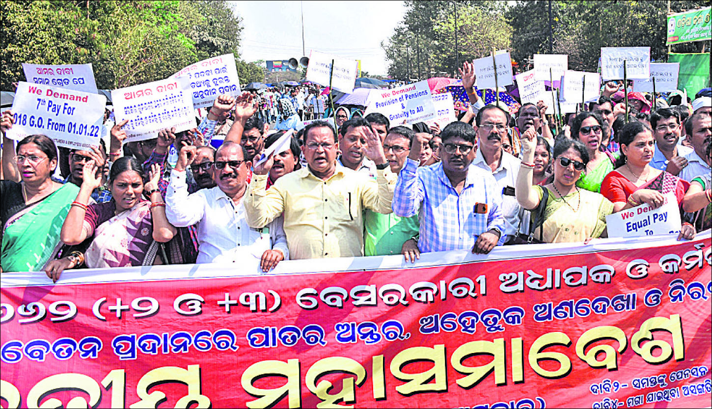 ସମାନ ଗ୍ରେଡ-ପେ’କୁ ସମାନ ଦରମା ବୃଦ୍ଧି, ସମସ୍ତ କର୍ମଚାରୀଙ୍କୁ ଗ୍ରାଚ୍ୟୁଇଟି ଓ ପେନସନ୍ ପରିସରଭୁକ୍ତ କରିବା ଭଳି ୪ଦଫା ଦାବି ନେଇ ନିଖିଳ ଓଡ଼ିଶା ୬୬୨(ଯୁକ୍ତ୨ ଓ ଯୁକ୍ତ୩) ବେସରକାରୀ ଅଧ୍ୟାପକ ଓ କର୍ମଚାରୀ ସଂଘ ଗତ ୧୩ ତାରିଖରୁ ଅହୋରାତ୍ର ଆନ୍ଦୋଳନ କରୁଛି। ଏହା ମଧ୍ୟରେ ଦୁଇ ଦୁଇଟି ମହାସମାବେଶ କରାଯାଇଥିଲେ ମଧ୍ୟ କୌଣସି ସୁଫଳ ମିଳିପାରି ନାହିଁ। ଦାବି ହାସଲ ପାଇଁ ସୋମବାର ପୁଣିଥରେ ମହାସମାବେଶ କରି ଗର୍ଜିଛନ୍ତି ୬୬୨ ବର୍ଗ କଲେଜ ଅଧ୍ୟାପକ ଓ କର୍ମଚାରୀ। ସରକାର ଆଲୋଚନାକୁ ନ ଡାକିଲେ ପରୀକ୍ଷା ବର୍ଜନ କରାଯିବ ବୋଲି ସଂଘ ଚେତାଇ ଦେଇଛି।