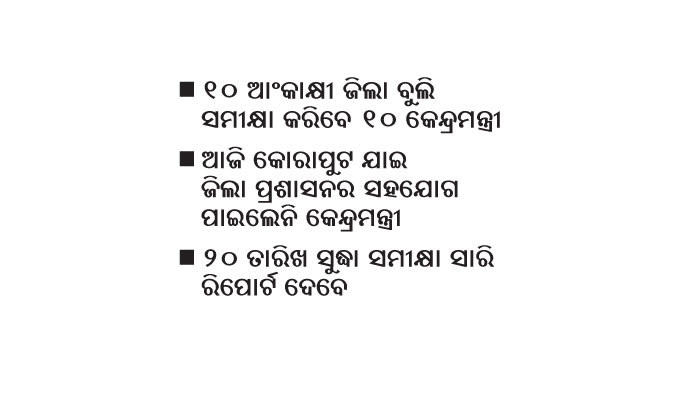 କେନ୍ଦ୍ରମନ୍ତ୍ରୀ ଅଶ୍ୱିନୀ ବୈଷ୍ଣବ ମାଲକାନଗିରି, ଅର୍ଜୁନ ମୁଣ୍ଡା କଳାହାଣ୍ଡି, ପ୍ରହ୍ଲାଦ ସିଂ ପଟେଲ ଗଜପତି, ସାଧ୍ୱୀ ନିରଞ୍ଜନା ଜ୍ୟୋତି ବଲାଙ୍ଗୀର, ପ୍ରଫେସର ଏସ.ବାଘେଲ ନୂଆପଡ଼ା, ସୁଶ୍ରୀ ଶୋଭା କରନ୍ଦଲାଜେ ନବରଙ୍ଗପୁର, ସୋମ ପ୍ରକାଶ ରାୟଗଡ଼ା ଏବଂ ଡ.ଶୁଭ ସରକାର କନ୍ଧମାଳ ଜିଲା ଗସ୍ତ କରିବେ ବୋଲି ରାଜ୍ୟ ସାଧାରଣ ସମ୍ପାଦକ ଗୋଲକ ମହାପାତ୍ର ସୂଚନା ଦେଇଛନ୍ତି। କେନ୍ଦ୍ରମନ୍ତ୍ରୀ ଧର୍ମେନ୍ଦ୍ର ପ୍ରଧାନ ଆସନ୍ତା ୧୩ରୁ ୪ଦିନିଆ ଢେଙ୍କାନାଳ ଗସ୍ତରେ ଯାଇ ଆକାଂକ୍ଷୀ ଯୋଜନା ସମୀକ୍ଷା କରିବେ। ଗସ୍ତ ଅବସରରେ କେନ୍ଦ୍ରମନ୍ତ୍ରୀମାନେ କେନ୍ଦ୍ରୀୟ ଜନକଲ୍ୟାଣ କାର୍ଯ୍ୟକ୍ରମର କାଯର୍ୟାନ୍ବୟନ, ବାସ୍ତବ ସ୍ଥିତି ନିରୀକ୍ଷଣ, ବିଭାଗୀୟ ଅଧିକାରୀଙ୍କ ସହ ଆଲୋଚନା କରିବା ସହିତ ହିତାଧିକାରୀ, ସ୍ଥାନୀୟ ଏମ୍ପି, ବିଧାୟକ, ଚେୟାରମ୍ୟାନ, ସରପଞ୍ଚ ଓ ଅନ୍ୟ ଜନପ୍ରତିନିଧି ଏବଂ ଦଳୀୟ କାର୍ଯ୍ୟକର୍ତ୍ତାଙ୍କ ସହ ବିସ୍ତୃତ ଆଲୋଚନା କରିବେ। ଏହାପରେ ସମସ୍ତ କେନ୍ଦ୍ରମନ୍ତ୍ରୀ ନିଜ ରିପୋର୍ଟ ପ୍ରଧାନମନ୍ତ୍ରୀଙ୍କୁ ପ୍ରଦାନ କରିବେ ବୋଲି ଜଣାପଡ଼ିଛି। ଗସ୍ତ ଅବସରରେ କେନ୍ଦ୍ରମନ୍ତ୍ରୀମାନେ ଖବରଦାତା ଜରିଆରେ ଗସ୍ତ ସମ୍ପର୍କରେ ଅବଗତ କରାଇବେ ବୋଲି ଗୋଲକ ସୂଚନା ଦେଇଛନ୍ତି।