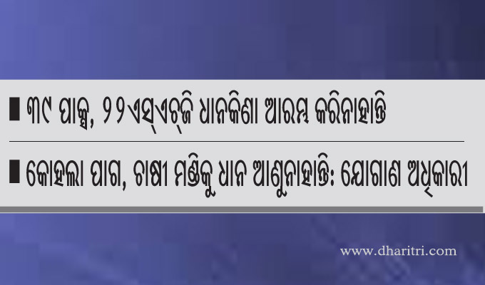 ଖରିଫ ଧାନ ବିକ୍ରି ପାଇଁ ୬୫ହଜାର ୫୨୩ଜଣ ଚାଷୀ ପଞ୍ଜୀକୃତ ହୋଇଛନ୍ତି। ତେବେ ଧାନ ବିକ୍ରି ଅନ୍ୟବର୍ଷ ତୁଳନାରେ ମନ୍ଥର ଗତିରେ ଚାଲିଛି। କୋହଲା ପାଗ ପାଇଁ ଧାନ ସଂଗ୍ରହ ଧିମେଇ ଥିବା ପ୍ରଶାସନ ସଫେଇ ଦେଉଛି। ଜିଲାର ୪୦ ମିଲର୍ସ ଚଳିତ ଧାନ ସଂଗ୍ରହ ପ୍ରକ୍ରିୟାରେ ସାମିଲ ହେବା ପାଇଁ ଯୋଗାଣ ନିଗମ ସହିତ ଚୁକ୍ତିନାମା କରିଛନ୍ତି। ତଦନୁଯାୟୀ ସେମାନଙ୍କୁ ଧାନ ସଂଗ୍ରହ ପାଇଁ ଟାର୍ଗେଟ୍ ମିଳିଛି। କିନ୍ତୁ ଏପର୍ଯ୍ୟନ୍ତ ୩୧ ମିଲର୍ସ ମଣ୍ଡିରୁ ଧାନ ନେଇଛି । ଚାଷୀଙ୍କ ଧାନ ସଂଗ୍ରହରେ ପାକ୍ସ, ଏସ୍ଏଚ୍ଜି ଓ ମିଲର୍ସମାନେ ଅସହଯୋଗ କରୁଥିବା ଅଭିଯୋଗ ହେଉଛି। ଏ ସମ୍ପର୍କରେ ଜିଲା ଯୋଗାଣ ଅଧିକାରୀ ସୁରେଶ ପାଣିଗ୍ରାହୀ କୁହନ୍ତି, ଧାନକିଣାରେ ସେମିତି କିଛି ସମସ୍ୟା ନାହିଁ। ଧାନରେ ଆଦ୍ରତା ରହିଛି। କୋହଲା ପାଗ ଯୋଗୁଁ ଚାଷୀ ମଣ୍ଡିକୁ ଧାନ ଆଣୁନାହାନ୍ତି। ସମସ୍ତ ମଣ୍ଡି ଖୋଲିବ ଓ ଆସନ୍ତା ସପ୍ତାହ ଠାରୁ ଧାନ ସଂଗ୍ରହ ପ୍ରକ୍ରିୟା ତ୍ୱରାନ୍ବିତ ହେବ।