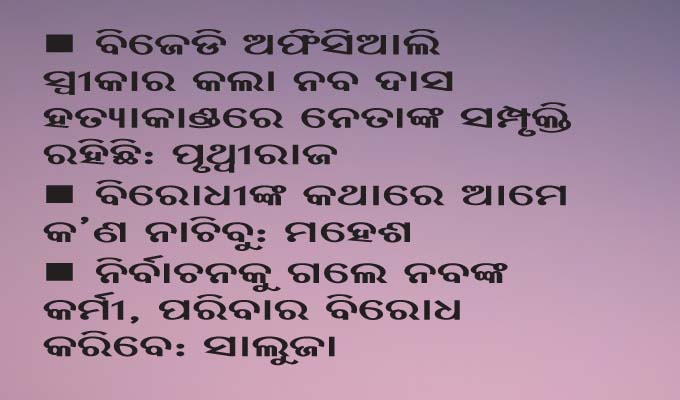 ଅନ୍ୟପକ୍ଷରେ ବିଜେଡିର ବରିଷ୍ଠ ନେତା ତଥା ଢେଙ୍କାନାଳ ଏମ୍ପି ମହେଶ ସାହୁ କହିଛନ୍ତି, ଦଳ ଓ ମୁଖ୍ୟମନ୍ତ୍ରୀ ନବୀନ ପଟ୍ଟନାୟକ କେଉଁ ଦୃଷ୍ଟିରୁ ଏବଂ କେଉଁ କାରଣ ପାଇଁ ଏଭଳି ନିଷ୍ପତ୍ତି ନେଇଛନ୍ତି ସେ ହିଁ କହିପାରିବେ। ବିଜୁ ଜନତା ଦଳରେ ସମସ୍ତେ ଦକ୍ଷ ନେତା। କିଏ କ’ଣ କହୁଛି ତାକୁ ନେଇ କିଛି କହିହେବନାହିଁ। ନବ ଦାସ ହତ୍ୟା ମାମଲାର ତଦନ୍ତ ଚାଲିଛି। ବିରୋଧୀ ଦଳ ବହୁତ କଥା କହୁଛନ୍ତି। ଜଣେ ଆକ୍ଟିଭ ଲୋକଙ୍କୁ ସବୁବେଳେ ସବୁ ଜାଗାରେ ଦାୟିତ୍ୱ ଦିଆଯିବ କି ? ସେ ଅଞ୍ଚଳରେ ଆମର ଆହୁରି ଆକ୍ଟିଭ ଲୋକ ଅଛନ୍ତି। ଏହା ଦଳର ନିଷ୍ପତ୍ତି ହୋଇଥିବ। ଦଳର ନିଷ୍ପତ୍ତିକୁ କାର୍ଯ୍ୟକର୍ତ୍ତାମାନେ ଗ୍ରହଣ କରିବେ। ବିରୋଧୀ ଦଳ କ’ଣ ପ୍ରତିକ୍ରିୟା ଦେଲେ, ତାଙ୍କ କଥାରେ କ’ଣ ନାଚିବୁ? ବିରୋଧୀ ଦଳ କ’ଣ ଜଜ୍ ବୋଲି ମହେଶ ପ୍ରଶ୍ନ କରିଛନ୍ତି।