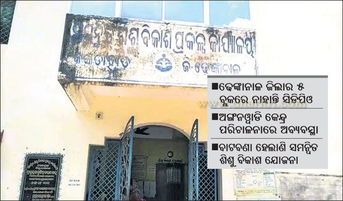 ଢେଙ୍କାନାଳ ଅଫିସ, ୨୫।୮: ସ୍କୁଲମୁହାଁ ହେବେ କୋମଳମତି ଶିଶୁ। ଛୋଟ ବୟସରୁ ସେମାନଙ୍କୁ ଯୋଗାଇ ଦିଆଯିବ ଶୈଖିକ ପରିବେଶ। ଖାଇବାକୁ ଦିଆଯିବ ପୁଷ୍ଟିକର ଖାଦ୍ୟ। ନିଆଯିବ ସ୍ବାସ୍ଥ୍ୟର ଯତ୍ନ। କେବଳ ଶିଶୁ ନୁହନ୍ତି, ଗର୍ଭବତୀ, ପ୍ରସୂତିଙ୍କ ଟିକାକରଣଠାରୁ ଆରମ୍ଭ କରି କିଶୋରୀ ବାଳିକାଙ୍କୁ ଦିଆଯିବ ସ୍ବାସ୍ଥ୍ୟ ସମ୍ପର୍କିତ ସବିଶେଷ ସୂଚନା। ଏଭଳି ମହତ୍ ଉଦ୍ଦେଶ୍ୟ ରଖି ଆରମ୍ଭ ହୋଇଛି ସମନ୍ବିତ ଶିଶୁ ବିକାଶ ଯୋଜନା। ଏଥିରେ ଉଭୟ କେନ୍ଦ୍ର ଏବଂ ରାଜ୍ୟ ସରକାର ଖର୍ଚ୍ଚ କରୁଛନ୍ତି ପର୍ଯ୍ୟାପ୍ତ ଅର୍ଥ। ଅଙ୍ଗନଓ୍ବାଡି କେନ୍ଦ୍ର ନିର୍ମାଣ, କର୍ମଚାରୀ ନିଯୁକ୍ତି ସାଙ୍ଗକୁ ଆନୁଷଙ୍ଗିକ ଭିତ୍ତିଭୂମି ପ୍ରସ୍ତୁତ ହେଉଛି। ହେଲେ ଏହାକୁ ଠିକ୍ ଭାବେ ପରିଚାଳନା କରିବାକୁ ନାହାନ୍ତି ପଦସ୍ଥ ଅଧିକାରୀ। ଢେଙ୍କାନାଳ ଜିଲାର ୮ ବ୍ଲକ ମଧ୍ୟରୁ ୫ଟିରେ ସମନ୍ବିତ ଶିଶୁ ବିକାଶ ଅଧିକାରୀ (ସିଡିପିଓ) ପଦବୀ ଖାଲି ପଡ଼ିଛି, ଯାହାକୁ ନେଇ ବିଭାଗରେ ସୃଷ୍ଟି ହୋଇଛି ଏକପ୍ରକାର ଅଚଳାବସ୍ଥା।
