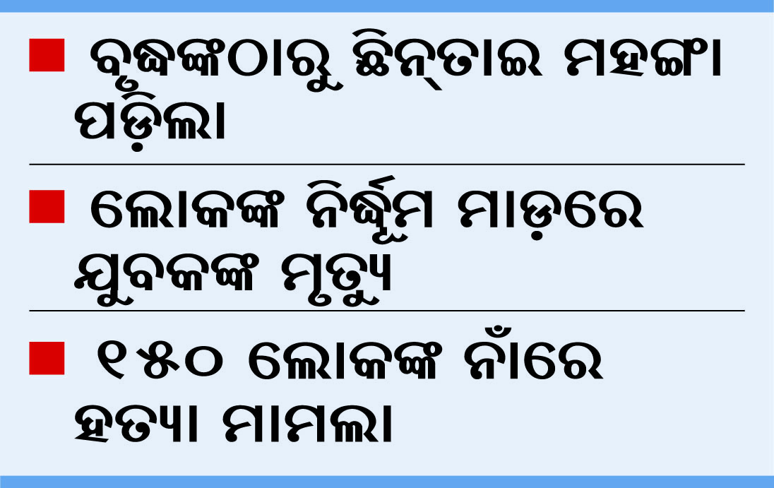 ନୟାଗଡ଼ ଅଫିସ,୨।୩:ସୁନାଚେନ ଲୁଟ୍ କରି ସ୍ଥାନୀୟ ଲୋକଙ୍କ ହାବୁଡ଼ରେ ପଡ଼ିଯାଇଥିଲେ ଜଣେ ଯୁବକ। ଲୋକେ ଆଇନ ହାତକୁ ନେଲେ ତାଙ୍କୁ ନିର୍ଦ୍ଧୂମ ପିଟିଥିଲେ। ଏଥିରେ ତାଙ୍କର ମୃତ୍ୟୁ ଘଟିଛି। ନୟାଗଡ଼ ସଦର ଥାନା ବାରବାଟି ଗଁାରେ ସୋମବାର ଘଟିଛି ଏହି ଘଟଣା। ମୃତ ଯୁବକ ଜଣକ ହେଲେ ପ୍ରଭାତ ରାଉତ ଓରଫ ପାଙ୍ଗା(୩୫)। ଘର ଶରଣକୁଳ ଥାନା ଗୋଡିପଡ଼ା ଫାଣ୍ଡି ଡିମିଶର ଗଁାରେ। କିନ୍ତୁ ସେ ଓଡ଼ଗଁାରେ ରହୁଥିଲେ। ପୋଲିସ ମୃତଦେହକୁ ବ୍ୟବଚ୍ଛେଦ ପାଇଁ ପଠାଇ ତଦନ୍ତ ଆରମ୍ଭ କରିଛି। ଏସ୍ପି ସିଦ୍ଧାର୍ଥ କାଟାରିଆ, ନୟାଗଡ ଏସ୍ଡିପିଓ ଶୁଭେନ୍ଦୁ ସିଂ ଏବଂ ଆଇଆଇସି ଶରତ ପାତ୍ର ଘଟଣାସ୍ଥଳରେ ପହଞ୍ଚ ତଦନ୍ତ କରିଥିଲେ। ପରେ ସାଇଣ୍ଟଫିକ ଟିମ୍ ଆସି ତଦନ୍ତ କରି ଫେରିଛି। ୧୫୦ ଲୋକଙ୍କ ନଁାରେ ୩୪/୨୧ ନମ୍ବରରେ ହତ୍ୟା ମାମଲା ରୁଜୁ ହୋଇଥିବା ଆଇଆଇସି ପାତ୍ର କହିଛନ୍ତି।
