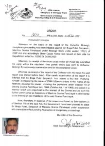 ସୂଚନାଯୋଗ୍ୟ, ସରପଞ୍ଚ ପୁଟେଲଙ୍କ ଭଣଜା ହେମନ୍ତ ପୁଟେଲଙ୍କ ଘର ସୁବର୍ଣ୍ଣପୁର ଜିଲା ଦିଗଶିରା ଗାଁରେ। ତାଙ୍କ ନାମରେ ୨୦୧୭-୧୮ ଆର୍ଥିକ ବର୍ଷରେ କାର୍ଯ୍ୟାଦେଶ ସଂଖ୍ୟା ୫୧୪୫/ତା ୬ା୧୨ା୧୭ରିଖରେ ଆବାସ ଯୋଜନାରେ ଏକ ଘର ଦିଆଯାଇଥିଲା। ଧାର୍ଯ୍ୟ ସମୟରେ ଘର କାମ ସାରିଥିବାରୁ ତାଙ୍କୁ ପ୍ରୋତ୍ସାହନ ରାଶି ବାବଦକ ୨୦ହଜାର ଟଙ୍କା ଦିଆଯାଇଥିଲା। ପରେ ସରପଞ୍ଚଙ୍କ ବାପା ଡମନ ପୁଟେଲଙ୍କ ନାମରେ ଆବାସ ଯୋଜନାରେ ଏକ ଘର ଆବଣ୍ଟିତ କରାଯାଇଥିଲା। ଏହାଜଣା ପଡିବା ପରେ ସାଧାରଣରେ ଅସନ୍ତୋଷ ପ୍ରକାଶ ପାଇଥିଲା। ୨୦୨୦ ଜାନୁୟାରୀ ୨୦ତାରିଖରେ ପାଟଣାଗଡ଼ରେ ଚାଲିଥିବା ଜିଲାପାଳଙ୍କ ଅଭିଯୋଗ ଶୁଣାଣି ଶିବିରରେ ପଞ୍ଚାୟତର ଜନସାଧାରଣ ଏନେଇ ଲିଖିତ ଭାବେ ଜଣାଇଥିଲେ। ଏହି ଘଟଣାରେ ତତ୍କାଳୀନ ଜିଲାପାଳ ଅରିନ୍ଦମ ଡାକୁଆ ଉପଜିଲାପାଳଙ୍କୁ ଘଟଣାର ତଦନ୍ତ ନିର୍ଦ୍ଦେଶ ଦେଇଥିଲେ ।ଅଭିଯୋଗରେ ସତ୍ୟତା ରହିଥିବା ଉପଜିଲାପାଳ ସେହି ମାସ ୩୧ ତାରିଖର ରିପୋର୍ଟରେ ଉଲ୍ଲେଖ କରିଥିଲେ । ଉକ୍ତ ରିପୋର୍ଟରେ ଉଭୟ ଆବାସ ବାବଦ ଟଙ୍କା ସାଢେ ୧୨ ପ୍ରତିଶତ ସୁଧ ଜମା କରିବା ପାଇଁ ସରପଞ୍ଚଙ୍କୁ ନିର୍ଦ୍ଦେଶ ଦେଇଥିଲେ। ଉପଜିଲାପଲାଙ୍କ ତଦନ୍ତ ରିପୋର୍ଟ ହସ୍ତଗତ ପରେ ୨୦୨୦ ଫେବୃୟାରୀ ୨୯ରେ ସେତେବେଳର ଜିଲାପାଳ ସରପଞ୍ଚଙ୍କ ବିରୋଧରେ କାର୍ଯ୍ୟାନୁଷ୍ଠାନ ପାଇଁ ପଞ୍ଚାୟତିରାଜ ନିର୍ଦ୍ଦେଶକଙ୍କୁ ସୁପାରିଶ କରିଥିଲେ। ସେହି ଅନୁସାରେ ଏହି କାର୍ଯ୍ୟାନୁଷ୍ଠାନ ନିଆଯାଇଛି।