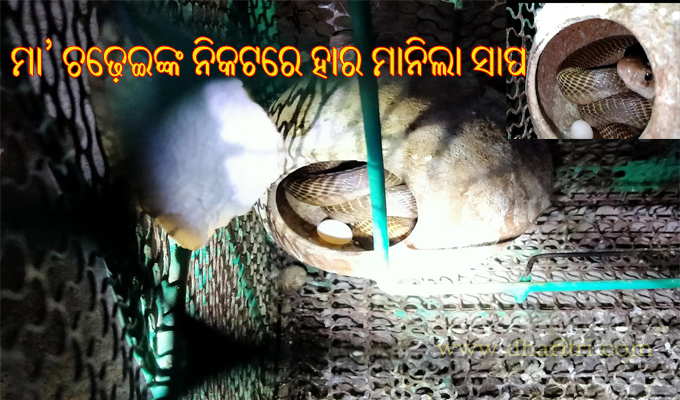 ତଥାପି ମା’ ଚଢ଼େଇମାନେ ଆକ୍ରମଣ ଜାରି ରଖିଥିଲେ। ଶେଷରେ ସାପଟି ନିଜକୁ ରକ୍ଷା କରିବାକୁ ଯାଇ ଏକ ମାଟିପାତ୍ର ଭିତରେ ପଶି ଯାଇଥିଲା। ସ୍ନେକ ହେଲ୍ପଲାଇନ୍ ସଦସ୍ୟମାନେ ସାପଟିକୁ ଟାଣିବା ପାଇଁ ଚେଷ୍ଟା କଲା ବେଳେ ମା’ ଚଢ଼େଇମାନଙ୍କ ରାଗ କମି ନ ଥିଲା। ସେ ବାରମ୍ବାର ସାପ ମୁଣ୍ଡକୁ ନିଜ ଥଣ୍ଟ ଦ୍ୱାରା ଖୁମ୍ପି ପକାଉଥିଲେ। ଫଳରେ ସାପଟି ଆଉ ବସା ଭିତରୁ ଆଦୌ ବାହାରି ନ ଥିଲା। ବାଧ୍ୟ ହୋଇ ସ୍ନେକ ହେଲ୍ପ ଲାଇନର ସଦସ୍ୟ ଦୁର୍ଗାମାଧବ ସତର୍କତା ସହିତ ପଞ୍ଜୁରୀ ଭିତରେ ହାତ ପୂରାଇ ପ୍ରଥମେ ଚଢ଼େଇ ତିନୋଟିକୁ ସୁରକ୍ଷିତ ଭାବରେ ଅନ୍ୟ ଏକ ସ୍ଥାନକୁ ସ୍ଥାନାନ୍ତର କରିଥିଲେ। ମା’ ଚଢ଼େଇ ୩ଟି କୁ ପଞ୍ଜୁରୀରୁ ବାହାର କରି ସାରିବା ପରେ ସାଟି ଆପେ ଆପେ ବସା ଭିତରୁ ବାହାରି ଆସିଥିଲା। ତା’ପରେ ପଞ୍ଜୁରୀ ଭିତରୁ ସାପ ସହ ଅନ୍ୟ ତିନୋଟି ମୃତ ଚଢେଇକୁ ଉଦ୍ଧାର କରାଯାଇଥିଲା। ସାପଟିକୁ ଗାଁଠାରୁ ଦୂରରେ ଥିବା ଏକ ଜଙ୍ଗଲରେ ଛାଡ଼ି ଦିଆଯାଇଛି । ଏହି ଘଟଣା ସ୍ଥାନୀୟ ଅଞ୍ଚଳରେ ଚର୍ଚ୍ଚାର କାରଣ ପାଲଟିଛି।