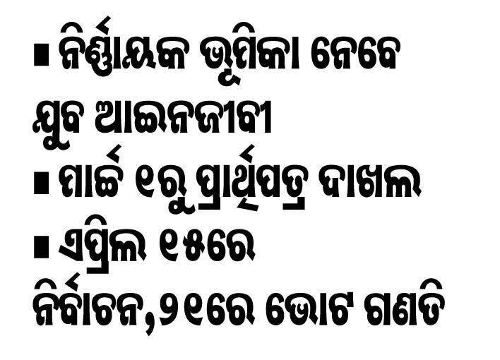କାଉନ୍ସିଲ ପକ୍ଷରୁ ରବିବାର ମିଳିଥିବା ପ୍ରେସ୍ ଇସ୍ତାହାର ଅନୁସାରେ, ହାଇକୋର୍ଟର ପୂର୍ବତନ ବିଚାରପତି ପ୍ରମଥ ପଟ୍ଟନାୟକ ରିଟର୍ନିଂ ଅଫିସର ଭାବେ କାର୍ଯ୍ୟ ତୁଲାଇବାକୁ ସମ୍ମତି ପ୍ରକାଶ କରିଛନ୍ତି। ଏଥିସହ ଆଇନଜୀବୀ ବାସୁଦେବ ପୂଜାରୀ ଓ ଆଇନଜୀବୀ ପ୍ରଫୁଲ୍ଲ କୁମାର ରଥ ସହକାରୀ ରିଟର୍ନିଂ ଅଫିସର ଭାବେ କାର୍ଯ୍ୟ ତୁଲାଇବେ। ବିଜ୍ଞପ୍ତି ଅନୁସାରେ, ଆସନ୍ତା ମାର୍ଚ୍ଚ ୧ରୁ ୬ ତାରିଖ ପର୍ଯ୍ୟନ୍ତ ପ୍ରତ୍ୟହ ପୂର୍ବାହ୍ନ ୧୧ଟାରୁ ଅପରାହ୍ନ ସାଢେ ୩ଟା ପର୍ଯ୍ୟନ୍ତ ପ୍ରାର୍ଥିପତ୍ର ଦାଖଲ ନିମନ୍ତେ ସମୟସୀମା ଧାର୍ଯ୍ୟ କରାଯାଇଛି। ମାର୍ଚ୍ଚ ୭ରୁ ୧୦ ତାରିଖ ପର୍ଯ୍ୟନ୍ତ ପ୍ରାର୍ଥିପତ୍ର ଯାଞ୍ଚ କରାଯିବ। କୌଣସି ପ୍ରାର୍ଥୀ ପ୍ରାର୍ଥିପତ୍ର ପ୍ରତ୍ୟାହାର କରିବାକୁ ଚାହିଁଲେ ମାର୍ଚ୍ଚ ୧୧ରୁ ୧୭ ତାରିଖ ପର୍ଯ୍ୟନ୍ତ ପ୍ରତ୍ୟହ ପୂର୍ବାହ୍ନ ୧୧ଟାରୁ ଅପରାହ୍ନ ୪ଟା ମଧ୍ୟରେ କରିପାରିବେ। ମାର୍ଚ୍ଚ ୧୭ ତାରିଖ ସନ୍ଧ୍ୟା ୫ଟାରେ ବୈଧ ପ୍ରାର୍ଥୀ ତାଲିକା ପ୍ରକାଶ ପାଇବ। ସେହିପରି ଏପ୍ରିଲ ୧୫ ତାରିଖ ପୂର୍ବାହ୍ନ ୧୦ଟାରୁ ଅପରାହ୍ନ ୫ଟା ପର୍ଯ୍ୟନ୍ତ ମତଦାନ ନିମନ୍ତେ ସମୟ ଧାର୍ଯ୍ୟ ହୋଇଛି। ଏପ୍ରିଲ ୨୧ରେ ଭୋଟ ଗଣତି ହେବ। ଭୋଟ ଗଣତି ନିମନ୍ତେ ତାରିଖରେ କୌଣସି ପରିବର୍ତ୍ତନ କରାଗଲେ ତାହା ଓଡ଼ିଶା ରାଜ୍ୟ ବାର୍ କାଉନ୍ସିଲ ଓ୍ବେବ୍ସାଇଟ୍ରେ ସୂଚାଇ ଦିଆଯିବ ବୋଲି ଜଣାଯାଇଛି।