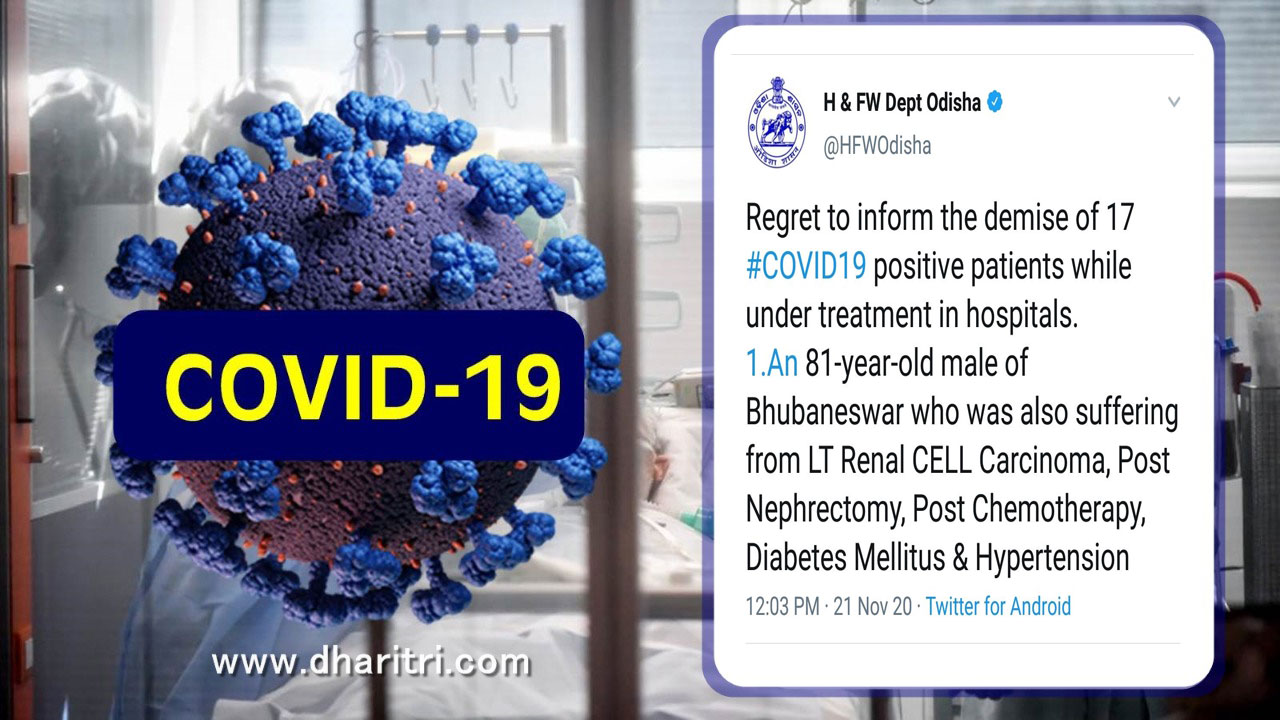 ଭୁବନେଶ୍ୱର,୨୧।୧୧(ବ୍ୟୁରୋ): ରାଜ୍ୟରେ ଶନିବାର ଆଉ ୧୭ ଜଣଙ୍କ ମୁଣ୍ଡ ନେଇଛି କରୋନା। ଏହାକୁ ମିଶାଇ ରାଜ୍ୟରେ କରୋନା ଜନିତ ମୃତ୍ୟୁ ସଂଖ୍ୟା ୧୬୨୫ରେ ପହଞ୍ଚିଥିବା ରାଜ୍ୟ ସ୍ବାସ୍ଥ୍ୟ ଓ ପରିବାର କଲ୍ୟାଣ ବିଭାଗ ପକ୍ଷରୁ ସୂଚନା ମିଳିଛି। ତେବେ ରାଜ୍ୟରେ କରୋନା ପଜିଟିଭ୍ଙ୍କ ସଂଖ୍ୟା କମୁଥିବା ବେଳେ କରୋନା ମୃତ୍ୟୁ ହାର କମିବାର ନାଁ ନେଉନି। ଯାହାକି ଚିନ୍ତାର ବିଷୟ ହୋଇଛି।