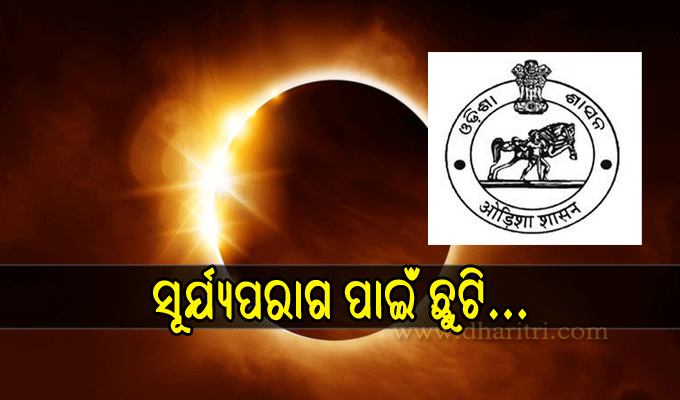 ଭୁବନେଶ୍ୱର,୨୨।୧୦(ବ୍ୟୁରୋ): ଦୀପାବଳିର ପରଦିନ ଆସନ୍ତା ୨୫ ତାରିଖ ମଙ୍ଗଳବାର ଦିନ ସୂର୍ଯ୍ୟପରାଗ ପଡ଼ୁଛି। ଏହାକୁ ଦୃଷ୍ଟିରେ ରଖି ଉକ୍ତ ଦିନକୁ ରାଜ୍ୟ ସରକାର ଛୁଟି ଘୋଷଣା କରିଛନ୍ତି। ତଦନୁଯାୟୀ ଏହି ଦିନ ରାଜ୍ୟର ସମସ୍ତ ସରକାରୀ ଅଫିସ, ସ୍କୁଲ କଲେଜ ଆଦି ସମସ୍ତ ଶିକ୍ଷାନୁଷ୍ଠାନ, ରାଜସ୍ବ ବିଭାଗୀୟ କୋର୍ଟ, ବ୍ୟାଙ୍କ ଏବଂ ଅନ୍ୟାନ୍ୟ ସଂସ୍ଥା ବନ୍ଦ ରହିବ।