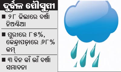 ଭୁବନେଶ୍ୱର,୨୮ା୬(ବ୍ୟୁରୋ):ଦୁର୍ବଳ ମୌସୁମୀ ପ୍ରଭାବ ଓଡ଼ିଶାରେ ଦେଖିବାକୁ ମିଳିଲାଣି। ରାଜ୍ୟର ଚାଷୀମାନେ ମୁଖ୍ୟତଃ ମୌସୁମୀ ବର୍ଷା ଉପରେ ନିର୍ଭର କରିଥାଆନ୍ତି। ବର୍ଷା ନ ଥିବାରୁ ଚାଷୀ ହାତ ବାନ୍ଧି ବସିଛନ୍ତି। ଚଳିତ ବର୍ଷ ଜୁନ୍ ୧୬ ତାରିଖରେ ରାଜ୍ୟକୁ ମୌସୁମୀ ପ୍ରବେଶ କରିଥିଲେ ମଧ୍ୟ ବର୍ଷାର ନାଁ ଗନ୍ଧ ନାହିଁ। ମିଳିଥିବା ସୂଚନା ଅନୁଯାୟୀ, ରାଜ୍ୟରେ ଜୁନ୍ ପହିଲାରୁ ୨୬ ତାରିଖ ମଧ୍ୟରେ ସ୍ବାଭାବିକଠାରୁ ୩୫% କମ୍ ବର୍ଷା ହୋଇଛି। କେବଳ ନୟାଗଡ଼ ଏବଂ ନୂଆପଡ଼ା ଜିଲାକୁ ବାଦ୍ଦେଲେ ରାଜ୍ୟର ୨୮ ଜିଲାରେ ନିଅଣ୍ଟିଆ ପରିସ୍ଥିତି ରହିଛି। ପାଣିପାଗ କାର୍ଯ୍ୟାଳୟ ପକ୍ଷରୁ ମିଳିଥିବା ସୂଚନା ଅନୁଯାୟୀ, ଜୁନ୍ ୧ରୁ ଏ ପର୍ଯ୍ୟନ୍ତ ପୁରୀରେ ସ୍ବାଭାବିକଠାରୁ ୮୫ ପ୍ରତିଶତ କମ୍ ବର୍ଷା ହୋଇଥିବା ବେଳେ ସୁନ୍ଦରଗଡ଼ ୬୫, ଭଦ୍ରକ ୫୪, କେନ୍ଦ୍ରାପଡ଼ା ୬୮, ନବରଙ୍ଗପୁର ୫୦, କୋରାପୁଟ ୫୨, ବୌଦ୍ଧ ୪୧, ଗଜପତି ୫୦, ଜଗତ୍ସିଂହପୁର ୫୨, ଝାରସୁଗୁଡ଼ାରେ ୪୪, ଭଦ୍ରକ ୫୪, ବଲାଙ୍ଗୀର ଜିଲାରେ ୪୭ ପ୍ରତିଶତ କମ୍ ବର୍ଷା ହୋଇଛି।