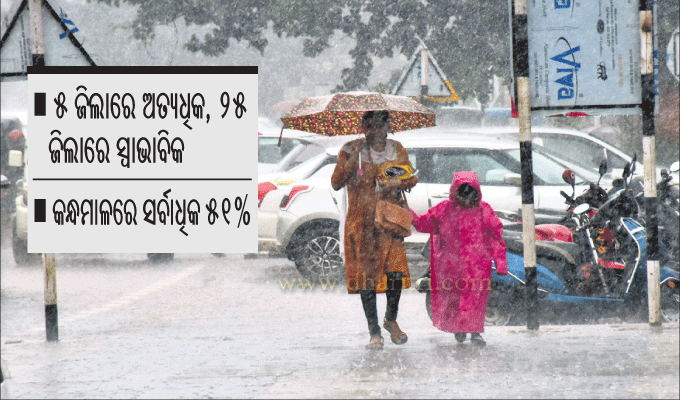 ଭାରତୀୟ ପାଣିପାଗ ବିଭାଗ ସୂଚନା ଅନୁଯାୟୀ ଜୁନ୍ ପହିଲାରୁ ସେପ୍ଟେମ୍ବର ୨୧ ମଧ୍ୟରେ ରାଜ୍ୟର ୨୫ ଜିଲାରେ ସ୍ବାଭାବିକ ବର୍ଷା ହୋଇଥିବା ବେଳେ ୫ ଜିଲାରେ ଅତ୍ୟଧିକ ବର୍ଷା ହୋଇଛି। ଏହି ସମୟରେ କନ୍ଧମାଳରେ ରାଜ୍ୟର ସର୍ବାଧିକ ବୃଷ୍ଟିପାତ ହୋଇଛି। ଏହି ଜିଲାରେ ୧୧୦୦.୬ ମିଲିମିଟର ବର୍ଷା ହେବାକୁ ଥିବା ବେଳେ ହୋଇଛି ୧୬୬୪.୯ ମିଲିମିଟର। ସ୍ବାଭାବିକଠାରୁ ୫୧ ପ୍ରତିଶତ ଅଧିକ ହୋଇଛି। ସେହିପରି କୋରାପୁଟରେ ସ୍ବାଭାବିକ ବର୍ଷା ୧୧୯୭.୧ ମିଲିମିଟର ହେବାକୁ ଥିବାବେଳେ ହୋଇଛି ୧୫୨୩.୮ ମିଲିମିଟର। ଏହି ଜିଲାରେ ୨୭ ପ୍ରତିଶତ ଅଧିକ ହୋଇଛି। ବୌଦ୍ଧରେ ସ୍ବାଭାବିକ (୯୯୧.୬ ମି.ମି)ଠାରୁ ୩୩ ପ୍ରତିଶତ, ଗଜପତିରେ ୨୪ ପ୍ରତିଶତ ଓ ଢେଙ୍କାନାଳରେ ୨୨ ପ୍ରତିଶତ ଅଧିକ ବର୍ଷା ହୋଇଛି। ସେହିପରି ନୟାଗଡ଼ରେ ସ୍ବାଭାବିକଠାରୁ ୧୭, ରାୟଗଡ଼ା ୧୭, ସୁନ୍ଦରଗଡ଼ ୧୪, ଦେବଗଡ଼ ୧୨, ଜଗତ୍ସିଂହପୁର ୧୧, ଗଞ୍ଜାମରେ ୧୧ ପ୍ରତିଶତ ଅଧିକ ବର୍ଷା ହୋଇଛି। ଚଳିତ ବର୍ଷ ଓଡ଼ିଶାରେ ସ୍ବାଭାବିକ ବର୍ଷା ହେବ ବୋଲି ପାଣିପାଗ ବିଭାଗ ପୂର୍ବାନୁମାନ କରିଥିଲା। ଅକ୍ଟୋବର ଦ୍ୱିତୀୟ ସପ୍ତାହରେ ମୌସୁମୀ ପ୍ରତ୍ୟାବର୍ତ୍ତନ କରିବା ସମ୍ଭାବନା ରହିଛି। ଏହି ସମୟ ମଧ୍ୟରେ ରାଜ୍ୟକୁ ଆହୁରି ବର୍ଷା ମିଳିବ ବୋଲି ପାଣିପାଗ ବିଭାଗ ପକ୍ଷରୁ ସୂଚନା ଦିଆଯାଇଛି।