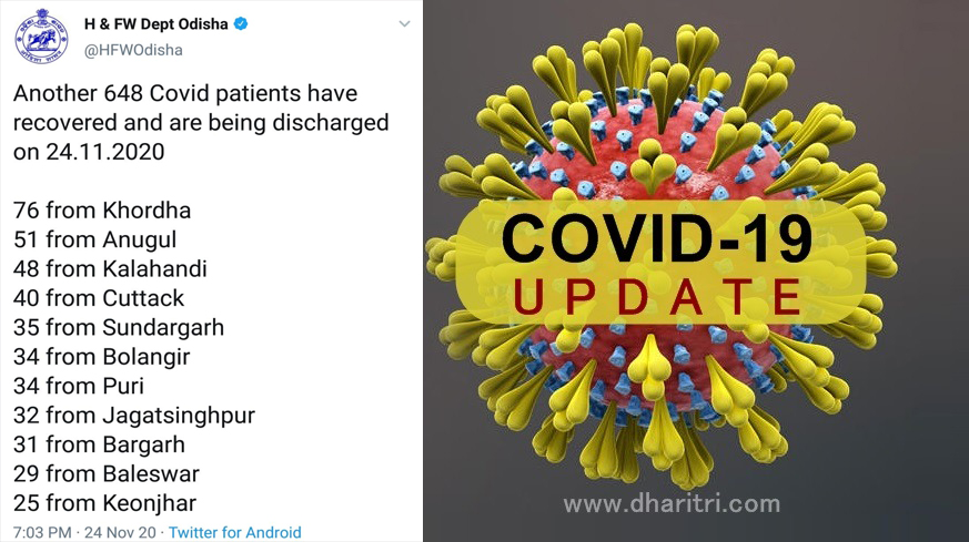 ଭୁବନେଶ୍ୱର,୨୪।୧୧(ବ୍ୟୁରୋ): ରାଜ୍ୟରେ ଆରୋଗ୍ୟ ହେଲେ ୬୪୮ କରୋନା ଆକ୍ରାନ୍ତ। ଏମାନଙ୍କୁ ମିଶାଇ ଆଜି ସୁଦ୍ଧା ୩୦୭୩୭୪ ଜଣ ସୁସ୍ଥ ହୋଇ ଘରକୁ ଫେରିଛନ୍ତି। ଏନେଇ ରାଜ୍ୟ ସ୍ବାସ୍ଥ୍ୟ ଓ ପରିବାର କଲ୍ୟାଣ ବିଭାଗ ପକ୍ଷରୁ ଟୁଇଟ୍ କରାଯାଇଛି। ମଙ୍ଗଳବାର ଆରୋଗ୍ୟ ହୋଇଥିବା କରୋନା ଆକ୍ରାନ୍ତଙ୍କ ଭିତରୁ ଖୋର୍ଦ୍ଧାରୁ ସର୍ବାଧିକ ୭୬ ଜଣ ଅଛନ୍ତି। ସେହିପରି ଅନୁଗୋଳରୁ ୫୧, କଳାହାଣ୍ଡିରୁ ୪୮, କଟକରୁ ୪୦, ସୁନ୍ଦରଗଡରୁ ୩୫, ବଲାଙ୍ଗୀରିରୁ ୩୪, ପୁରୀରୁ ୩୪, ଜଗତସିଂହପୁରରୁ ୩୨, ବରଗଡରୁ ୩୧, ବାଲେଶ୍ୱରୁ ୨୯, କେନ୍ଦୁଝରରୁ ୨୫, କେନ୍ଦ୍ରାପଡରୁ ୨୪, ମୟୁରଭଞ୍ଜରୁ ୨୪, ଢେଙ୍କାନାଳରୁ୨୩, ନୁଆପଡାରୁ ୨୦, ସମ୍ବଲପୁରରୁ ୨୦,ରାୟାଗଡାରୁ ୧୮, ନବରଙ୍ଗପୁରର ୧୩, ବୌଦ୍ଧରୁ ୧୨, ମାଲକାନଗିରିରୁ ୧୦, ଝାରସୁଗୁଡାରୁ ୯, ଗଞ୍ଜାମରୁ ୮, ଭଦ୍ରକରୁ ୬, ଯାଜପୁରରୁ ୪, କନ୍ଧମାଳରୁ ୪, ଦେଓଗଡରୁ ୩, ଗଜପତିରୁ ୩, ସୋନପୁରରୁ ୩, କୋରାପୁଟରୁ ୧, ନୟାଗଡରୁ ୧ ସୁସ୍ଥ ହୋଇଛନ୍ତି।