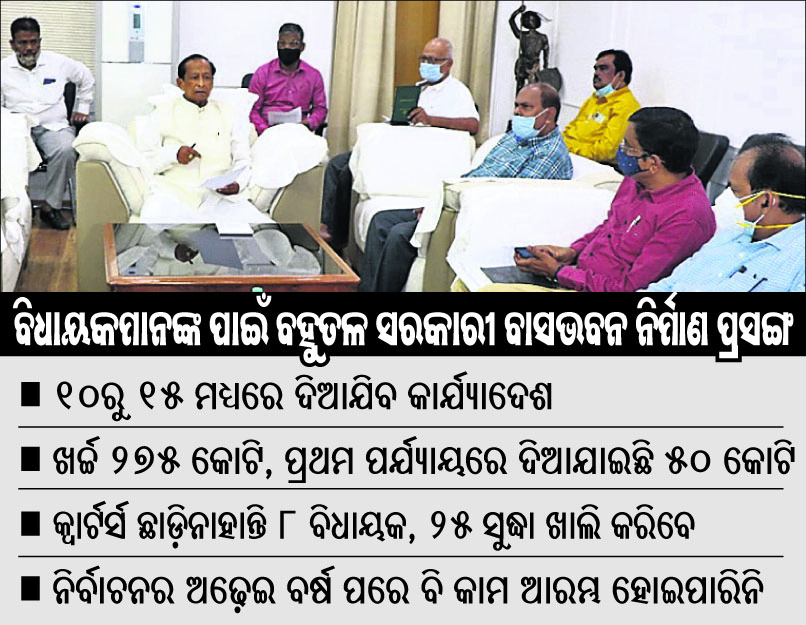 ଭୁବନେଶ୍ୱର,୧୫ା୩(ବ୍ୟୁରୋ):ରାଜଧାନୀ ଭୁବନେଶ୍ୱରରେ ବିଧାୟକ ଏବଂ ବିଧାୟିକାମାନଙ୍କ ପାଇଁ ନିର୍ମାଣ ହେବାକୁ ଥିବା ବହୁତଳ ସରକାରୀ ବାସଭବନ କାର୍ଯ୍ୟ ଏପର୍ଯ୍ୟନ୍ତ ଆରମ୍ଭ ହୋଇପାରିନାହିଁ। ଏଥିଲାଗି ବାଚସ୍ପତିଙ୍କ ଅଧ୍ୟକ୍ଷତାରେ ଏକାଧିକ ବୈଠକ ହୋଇସାରିଥିବା ବେଳେ ବିଧାୟକମାନଙ୍କୁ ସରକାରୀ ବାସଭବନ ଖାଲି କରିବା ପାଇଁ ବହୁ ଥର କୁହାଯାଇଛି। ହେଲେ ଏବେ ବି ୮ ଜଣ ବିଧାୟକ ସରକାରୀ ବାସଭବନ ଖାଲି ନ କରି ରହିଛନ୍ତି। ଫଳରେ ନବନିର୍ବାଚିତ ବିଧାୟକଙ୍କ ଲାଗି ନିର୍ବାଚନର ଅଢ଼େଇ ବର୍ଷ ପରେ ମଧ୍ୟ ବହୁତଳ ସରକାରୀ ବାସଭବନ ନିର୍ମାଣ ଆରମ୍ଭ ହୋଇପାରି ନାହିଁ। ଏହି କାମ ସରିବାକୁ ମଧ୍ୟ ଆହୁରି ୨ ବର୍ଷ ଲାଗିବ ବୋଲି ବାଚସ୍ପତି ସୂର୍ଯ୍ୟନାରାୟଣ ପାତ୍ର ସୋମବାର କହିଥିଲେ।