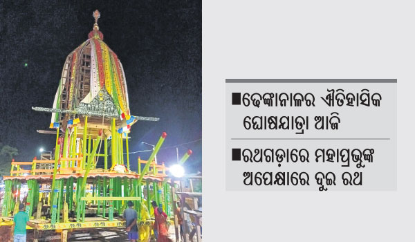 କରୋନା କଟକଣା ପାଇଁ ଦୁଇବର୍ଷ ହେଲା ବଳରାମ ମନ୍ଦିର ପରିସରରେ ପ୍ରତୀକାତ୍ମକ ଭାବେ ପାଳନ କରାଯାଉଥିଲା ଘୋଷଯାତ୍ରା। ଚଳିତ ବର୍ଷ ସଂକ୍ରମଣ ନିୟନ୍ତ୍ରଣରେ ରହିଥିବାରୁ ସରକାର ସାର୍ବଜନୀନ ରଥଯାତ୍ରାକୁ ଅନୁମତି ଦେଇଛନ୍ତି। ଢେଙ୍କାନାଳର ଐତିହାସିକ ରଥଯାତ୍ରାକୁ ନେଇ ଶ୍ରଦ୍ଧାଳୁଙ୍କ ମନରେ ବିପୁଳ ଉତ୍କଣ୍ଠା ପ୍ରକାଶ ପାଇଥିବାବେଳେ ରଥଗଡ଼ାରେ ଚତୁର୍ଦ୍ଧା ବିଗ୍ରହଙ୍କ ଅପେକ୍ଷାରେ ଅଛନ୍ତି ଦୁଇରଥ। ୪୨ ଫୁଟ ଉଚ୍ଚତା ତଥା ୧୨ ଚକ ବିଶିଷ୍ଟ ବଡ଼ରଥରେ ଏକାକୀ ବିଜେ କରିବେ ମହାପ୍ରଭୁ ଜଗନ୍ନାଥ। କାରଣ ପାଷାଣ ବିଗ୍ରହ ହୋଇଥିବାରୁ ଶ୍ରୀବଳରାମ ଗୁଣ୍ଡିଚାଯାତ୍ରାରେ ସାମିଲ ହେବା ପରମ୍ପରା ନାହିଁ। ଅନ୍ୟପଟେ ୩୪ ଫୁଟ ଉଚ୍ଚ ଏବଂ ୮ ଚକ ବିଶିଷ୍ଟ ସାନରଥରେ ରାଜବାଟୀରେ ପୂଜା ପାଉଥିବା ବିଗ୍ରହ ବିରାଜମାନ କରିବେ। ୧୦୦ ବର୍ଷରୁ ଅଧିକ ପୁରୁଣା ଢେଙ୍କାନାଳର ରଥଯାତ୍ରାରେ ଯୋଡ଼ି ହୋଇଛି ନୂଆ ପରମ୍ପରା। ୧୯୯୮-୯୯ରୁ ସାନରଥକୁ କେବଳ ମହିଳାମାନେ ଟାଣି ଆସୁଛନ୍ତି। ଘୋଷଯାତ୍ରାକୁ ଶୃଙ୍ଖଳିତ କରିବା ପାଇଁ ପୋଲିସ ଫୋର୍ସ ମୁତୟନ କରାଯିବ। ଆଇନଶୃଙ୍ଖଳା ରକ୍ଷାରେ ପ୍ରଶାସନକୁ ସହଯୋଗ କରିବାକୁ ଜିଲାପାଳ ସରୋଜ କୁମାର ସେଠୀ ଏବଂ ଏସ୍ପି ଏଲ୍. ଦିବ୍ୟା ଭି. ନିବେଦନ କରିଛନ୍ତି।