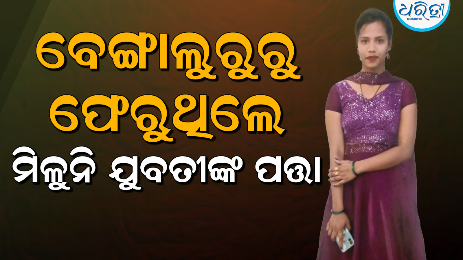 ବୈଶିଙ୍ଗା,୨୧ା୮(ରତନ ଦାଶ): ମୟୂରଭଞ୍ଜ ଜିଲାର ବୈଶିଙ୍ଗା ଥାନା ଅର୍ନ୍ତଗତ ପଦ୍ମନାଭପୁର ଗ୍ରାମର ଯୁବତୀ ବେଙ୍ଗାଲୁରୁରୁ ଫେରୁଥିବାବେଳେ ଭୁଲ ବଶତଃ ଅନ୍ୟ ଏକ ଟ୍ରେନ୍ରେ ଉଠିଯିବା ପରେ ତାଙ୍କର ଆଉ କୌଣସି ଖୋଜଖବର ମିଳୁ ନ ଥିବା ପରିସ୍ଥିତିରେ ବ୍ୟସ୍ତ ବିବ୍ରତ ହୋଇପଡ଼ିଛନ୍ତି ପରିବାର ଲୋକେ।