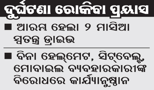 ଦୁର୍ଘଟଣାପ୍ରବଣ ଜୋନ୍, ଜାତୀୟ ରାଜପଥ ଏବଂ ରାଜ୍ୟ ରାଜପଥର ପ୍ରମୁଖ ଜଙ୍କ୍ଶନ ନିକଟରେ ପୋଲିସ ସହିତ ମିଳିତ ଭାବେ ଏହି ସ୍ବତନ୍ତ୍ର ଏନ୍ଫୋର୍ସମେଣ୍ଟ ଡ୍ରାଇଭ୍ କରାଯିବ ବୋଲି ପରିବହନ ଅତିରିକ୍ତ କମିଶନର ଲାଲମୋହନ ସେଠୀ କହିଛନ୍ତି। ଶୀତ ଋତୁରେ ସଡ଼କ ଦୁର୍ଘଟଣା ଏବଂ ମୃତ୍ୟୁହାର ରୋକିବା ପାଇଁ ଯାନବାହନ ଚାଳକଙ୍କ ମଧ୍ୟରେ ଏକ ଦାୟିତ୍ୱବୋଧକ ମନୋଭାବ ସୃଷ୍ଟି କରିବା ଏହି ଡ୍ରାଇଭ୍ର ମୂଳ ଉଦ୍ଦେଶ୍ୟ। ନଭେମ୍ବରରୁ ଫେବୃୟାରୀ ମଧ୍ୟରେ ଅଧିକ ଦୁର୍ଘଟଣା ଏବଂ ମୃତ୍ୟୁ ଘଟିଥିବା ଦେଖାଯାଇଛି। ତେଣୁ ଏହା କିପରି ହ୍ରାସ ପାଇବ ସେ ଦିଗରେ ଏହା ଏକ ପ୍ରୟାସ ବୋଲି ସେ କହିଛନ୍ତି।