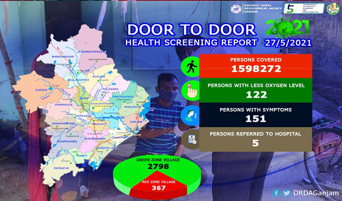 ଛତ୍ରପୁର,୨୮।୫(ଡି.ଏନ୍‌.ଏ.): ଗଞ୍ଜାମ ଜିଲାରେ ଦିନକୁ ଦିନ କରୋନା ସଂକ୍ରମିତଙ୍କ ସଂଖ୍ୟା ବୃଦ୍ଧି ପାଉଛି। ଏହି ପରିପ୍ରେକ୍ଷୀରେ ଜିଲାର ସମସ୍ତ ଘରକୁ ଘର ଯାଇ ସମସ୍ତ ପରିବାର ସଦସ୍ୟଙ୍କ ସ୍ବାସ୍ଥ୍ୟ ସ୍କ୍ରିନିଂ ଗତ ୧୯ ତାରିଖରୁ ଚାଲିଛି । ଗୁରୁବାର ସୁଦ୍ଧା ଗଞ୍ଜାମର ୧୫ ଲକ୍ଷ ୯୦୮ ହଜାର ୨୭୨ ଜଣଙ୍କ ସ୍ବାସ୍ଥ୍ୟ ସ୍କ୍ରିନିଂ ହୋଇଥିବା ପିଡି ସିନ୍ଧେ ଦତ୍ତାତ୍ରୟ ଭାଉସାହେବ ସୂଚନା ଦେଇଛନ୍ତି । ଏଥିରୁ ୧୨୨ ଜଣଙ୍କ ଠାରେ କରୋନା ଲକ୍ଷଣ ଚି଼ହ୍ନଟ ହୋଇଛି ୧୫୧ ଜଣଙ୍କ ଅକ୍ସିଜେନ ସ୍ତର କମ ଥିବା ଜଣାପଡିଥିଲା । ୫ ଜଣଙ୍କୁ ଚିକିତ୍ସା ପାଇଁ ହସ୍ପିଟାଲ ପଠାଯାଇଥିବା କୁହାଯାଇଛି। ଆଶା କର୍ମୀ, ସ୍ବଚ୍ଛସାଥୀ, ସୁପରଭାଇଜର, ଅଙ୍ଗନଓ୍ବାଡିକର୍ମୀମାନେ ସମସ୍ତ ଘରର ସଦସ୍ୟଙ୍କ ଅକ୍ସିମିଟରରେ ଅମ୍ଳଜାନ ସ୍ତର ସହ ଶରୀରର ତାପମାତ୍ରା ଥର୍ମାଲ ସ୍କ୍ରିନିଂରେ ଯାଞ୍ଚ କରୁଛନ୍ତିି। ଅପରପକ୍ଷରେ ଜିଲାର ସହରଠାରୁ ଗ୍ରାମାଞ୍ଚଳ ଅଧିକ ସୁରକ୍ଷିତ ରହିଛି। ବ୍ରହ୍ମପୁର ଓ ଛତ୍ରପୁର ସହରରେ ଅଧିକ କରୋନା ସଂକ୍ରମଣ ବଢୁଛି । ଏଥିସହ ଏହି ସହରରେ ଅଧିକ କରୋନା ସଂକ୍ରମିତ ସକ୍ରିୟ ଅଛନ୍ତି ଜିଲାର ୨୭୯୮ଟି ଗାଁ ଗ୍ରୀନ ଜୋନରେ ଥିବାବେଳେ ୩୬୭ ଗାଁ ରେଡ୍‌ ଜୋନରେ ରହିଛି।