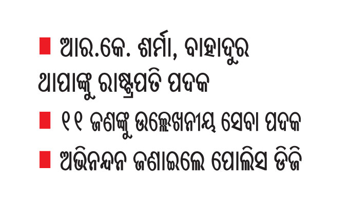 ଭୁବନେଶ୍ୱର,୨୬।୧(ବ୍ୟୁରେ): ସାଧାରଣତନ୍ତ୍ର ଦିବସ ଅବସରରେ ବିଭିନ୍ନ କ୍ଷେତ୍ରରେ ଉତ୍ତମ କାର୍ଯ୍ୟ ଓ ଉଲ୍ଲେଖନୀୟ ସେବା ପାଇଁ ସ୍ବରାଷ୍ଟ୍ର ମନ୍ତ୍ରଣାଳୟ ପକ୍ଷରୁ ବିଭିନ୍ନ ବର୍ଗରେ ୯୪୬ ଜଣଙ୍କୁ ପୋଲିସ ପଦକ ଘୋଷଣା କରାଯାଇଛି। ଚଳିତବର୍ଷ ଓଡ଼ିଶାରୁ ମୋଟ ୧୩ ଜଣଙ୍କୁ ପୋଲିସ ପଦକ ମିଳିବ। ୨ଜଣଙ୍କୁ ରାଷ୍ଟ୍ରପତି ପୋଲିସ ପଦକ ଓ ୧୧ ପୋଲିସ କର୍ମଚାରୀଙ୍କୁ ଉଲ୍ଲେଖନୀୟ ସେବା ନିମନ୍ତେ ପଦକ ପ୍ରଦାନ କରାଯିବ। ଗୋଇନ୍ଦା ନିର୍ଦ୍ଦେଶକ ଆର.କେ. ଶର୍ମା ଓ ବିଜୁ ପଟ୍ଟନାୟକ ଷ୍ଟେଟ୍ ପୋଲିସ ଏକାଡେମୀ (ବିପିଏସ୍ପିଏ)ର ଡେପୁଟି ସୁବେଦାର ବୁଦ୍ଧି ବାହାଦୁର ଥାପାଙ୍କୁ ରାଷ୍ଟ୍ରପତି ପୋଲିସ ପଦକରେ ସମ୍ମାନିତ କରାଯିବ। ଏହାସହ ଆଇଜି (ଆଇନ ଶୃଙ୍ଖଳା) ପ୍ରବୀଣ କୁମାର, ଏଏସ୍ପି ରବୀନ୍ଦ୍ର ଦାସ, ଏଏସ୍ପି ଭବାନୀ ଶଙ୍କର ମିଶ୍ର, ବିପିଏସ୍ପିଏ ଡେପୁଟି କମାଣ୍ଡାଣ୍ଟ ଅଶୋକ ଦେହୁରୀ, ଏସ୍ଓଜିର ଡେପୁଟି କମାଣ୍ଡାଣ୍ଟ ବୁଦ୍ଧ ତମଙ୍ଗ, ଏସିପି ପ୍ରକାଶ ପାଲ୍, ଏଏସ୍ଆଇ ମନୋରଞ୍ଜନ ଶତପଥୀ, ହାବିଲଦାର ସରୋଜ ଭୋଇ, ହାବିଲଦାର ସେକ୍ ନାଶିରୁଦ୍ଦିନ, କନ୍ଷ୍ଟେବଲ ଗୌତମ ପାତ୍ର ଓ ସୁବେଦାର ହେମନ୍ତ ବାହାଦୁର ଖାତ୍ରୀଛେତ୍ରୀଙ୍କୁ ପୋଲିସ ସେବା ପଦକ ପ୍ରଦାନ କରାଯିବ। ଏନେଇ ସୋମବାର ଡିଜିପି ଅଭୟ ଟୁଇଟ୍ ଜରିଆରେ ପୋଲିସ ପଦକୁ ପାଇବାକୁ ମନୋନୀତ ସମସ୍ତଙ୍କୁ ଅଭିନନ୍ଦନ ଜଣାଇବା ସହ ଓଡିଶା ପାଇଁ ଏହା ଗର୍ବର ବିଷୟ ବୋଲି କହିଛନ୍ତି। ସ୍ବାଧୀନତା ଦିବସରେ ଏହି ପଦକ ପ୍ରଦାନ କରାଯିବ।