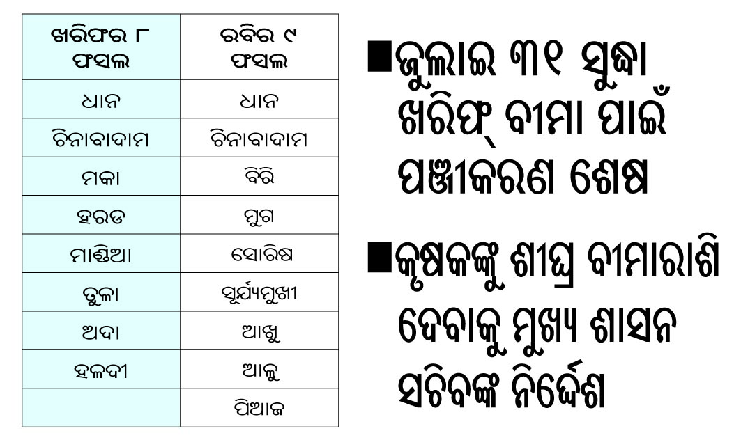 ଖରିଫ୍‌ର ୮, ରବିର ୯ ଫସଲ ବୀମାଭୁକ୍ତ ହେବ