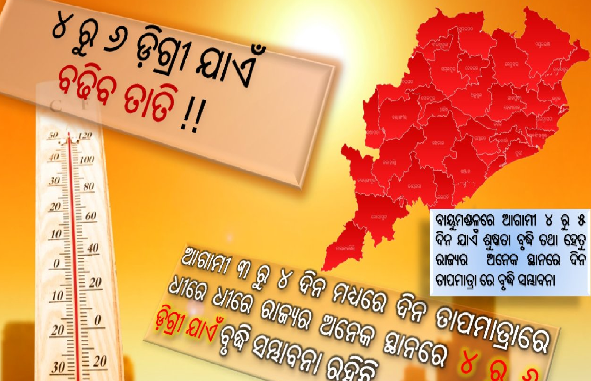 ଅନ୍ୟପଟେ ଆସନ୍ତା ୩ ଦିନ ପର୍ଯ୍ୟନ୍ତ ତାପମାତ୍ରାରେ ବିଶେଷ ପରିବର୍ତ୍ତନ ହେବାର ସମ୍ଭାବନା ନାହିଁ। ୧୧ ତାରିଖ ପରେ ଦିନର ସର୍ବାଧିକ ତାପମାତ୍ରା ବୃଦ୍ଧି ହେବ। କିଛି କିଛି ସ୍ଥାନରେ ଦିନର ସର୍ବାଧିକ ତାପମାତ୍ରା ୪ରୁ ୬ ଡିଗ୍ରି ଯାଏଁ ବୃଦ୍ଧି ହେବାର ସମ୍ଭାବନା ରହିଥିବା ପାଣିପାଗ ବିଭାଗ ପକ୍ଷରୁ ପୂର୍ବାନୁମାନ କରାଯାଇଛି ।