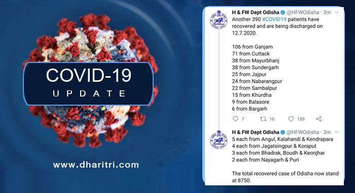 ଭୁବନେଶ୍ୱର,୧୨। ୭(ବ୍ୟୁରୋ)-ରାଜ୍ୟରେ ରବିବାର ଆଉ ୩୯୦ କରୋନା ଆକ୍ରାନ୍ତ ସୁସ୍ଥ ହୋଇଛନ୍ତି। ଗଞ୍ଜାମରୁ ସର୍ବାଧିକ ସୁସ୍ଥ ୧୦୬ ଜଣ ଆକ୍ରାନ୍ତ ସୁସ୍ଥ ହୋଇଥିବାବେଳେ କଟକରୁ ୭୧, ଯାଜପୁରରୁ୨୫, ନବରଙ୍ଗପୁରରୁ ୨୪, ସମ୍ବଲପୁରରୁ ୨୨, ଖୋର୍ଦ୍ଧାରୁ ୧୫, ବାଲେଶ୍ୱରରୁ ୯, ବରଗଡରୁ ୬ ଜଣ ସୁସ୍ଥ ହୋଇଛନ୍ତି। ସେହିପରି ମୟୁରଭଞ୍ଜ ଓ ସୁନ୍ଦରଗଡରୁ ୩୮ଜଣ ଲେଖାଏଁ, ଅନୁଗୋଳ, କଳାହାଣ୍ଡି ଓ କେନ୍ଦ୍ରାପଡାରୁ ୫ ଜଣ ଲେଖାଏଁ, ଜଗତସିଂହପୁର ଓ କୋରାପୁଟରୁ ୪ ଜଣ ଲେଖାଏଁ, ଭଦ୍ରକ, ବୌଦ୍ଧ ଓ କେନ୍ଦୁଝରରୁ ୩, ପୁରୀ ଓ ନୟାଗଡରୁ ୨ଜଣ ଲେଖାଏଁ ସୁସ୍ଥ ହୋଇଛନ୍ତି। ଏହାକୁ ମିଶାଇ ବର୍ତ୍ତମାନ ସୁସ୍ଥ ହୋଇଥିବା ସଂକ୍ରମିତଙ୍କ ସଂଖ୍ୟା ୮୭୫୦ରେ ପହଞ୍ଚିଛି। ରାଜ୍ୟ ସରକାରଙ୍କ ସ୍ବାସ୍ଥ୍ୟ ଓ ପରିବାର କଲ୍ୟାଣ ବିଭାଗ ତରଫରୁ ଟୁଇଟ ଜରିଆରେ ଏହି ସୂଚନା ଦିଆଯାଇଛି।