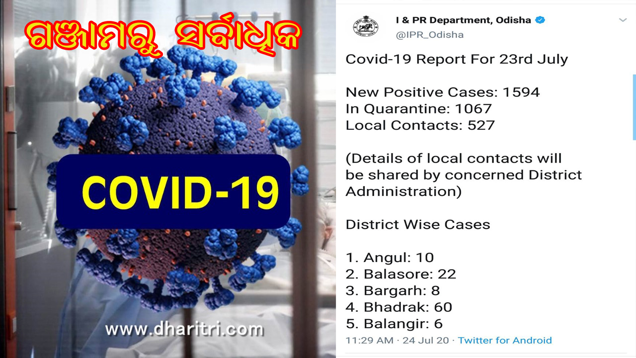 ଭୁବନେଶ୍ୱର,୨୪ା୭(ବ୍ୟୁରୋ) : ଶୁକ୍ରବାର ୨୮ଟି ଜିଲାରୁ ସର୍ବାଧିକ ୧,୫୯୪ କରୋନା ପଜିଟିଭ୍ ଚିହ୍ନଟ ହୋଇଛନ୍ତି। ଏହାକୁ ମିଶାଇ ରାଜ୍ୟରେ ମୋଟ୍ ଆକ୍ରାନ୍ତଙ୍କ ସଂଖ୍ୟ ୨୨,୬୯୩କୁ ବୃଦ୍ଧି ପାଇଥିବା ରାଜ୍ୟ ସୂଚନା ଓ ଲୋକସମ୍ପର୍କ ବିଭାଗ ପକ୍ଷରୁ ସୂଚନା ଦିଆଯାଇଛି। ଏହି ଆକ୍ରାନ୍ତମାନଙ୍କ ମଧ୍ୟରୁ ୧୦୬୭ କ୍ୱାରାଣ୍ଟାଇନ୍ରୁ ଏବଂ ୫୨୭ଜଣ ସ୍ଥାନୀୟ ସଂକ୍ରମିତ ବୋଲି ଜଣାପଡ଼ିଛି।
