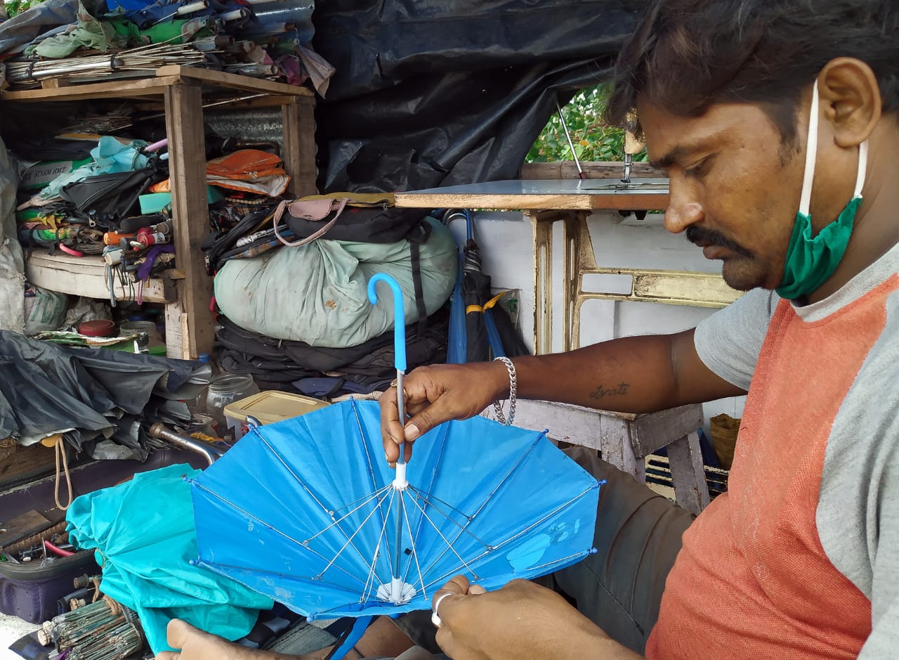 କଟକ ରାଣୀହାଟ ପୋଲ ଫୂଟପାଥ ଉପରେ ବ୍ୟକ୍ତିଜଣକ ଛତା ମରାମତି କରୁଛନ୍ତି