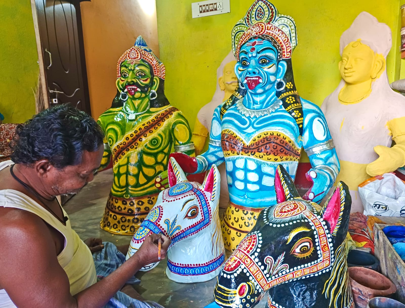 କଟକ କାଠଗଡ଼ା ସାହି ଅଂଚଳରେ ପଞ୍ଚୁ ଦୋଳ ଓ ଦୋଳ ବିମାନ ମେଳଣ ପାଇଁ ଶିଳ୍ପୀ ସଦାନନ୍ଦ ବେହେରା କାଗଜରେ ପାରମ୍ପରିକ ମୁଖା ପ୍ରସ୍ତୁତ କରୁଛନ୍ତି