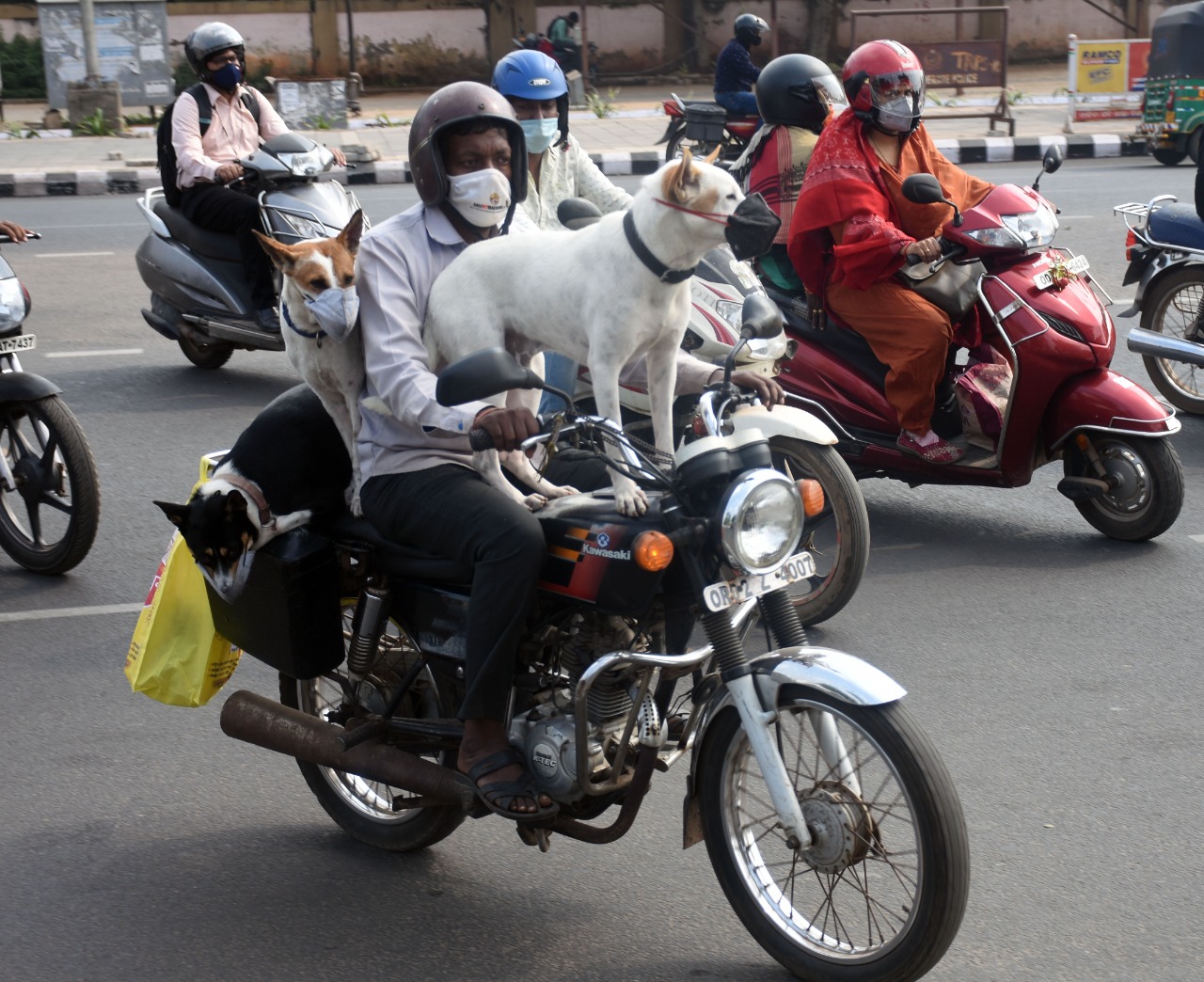 ଭୁବନେଶ୍ୱର ରାମମନ୍ଦିର ଛକ ଟ୍ରାଫିକ ନିକଟରେ ମାସ୍କ ପିନ୍ଧିଥିବା କୁକୁର ବାଇକରେ ବସି ଯାଉଛନ୍ତି