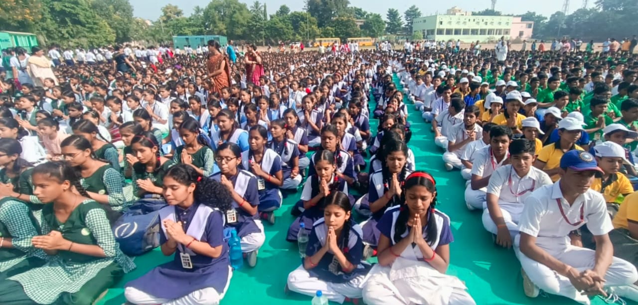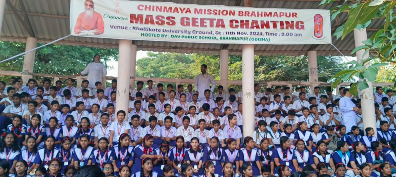 ଖଲ୍ଲିକୋଟ ଖେଳ ପଡିଆ ଠାରେ ଚିନ୍ମୟ ମିଶନ ପକ୍ଷରୁ ବ୍ରହ୍ମପୁରର ବିଭିନ୍ନ ସ୍କୁଲର ପିଲାମାନେ ସମୂହ ଗୀତା ପାଠ କରୁଛନ୍ତି