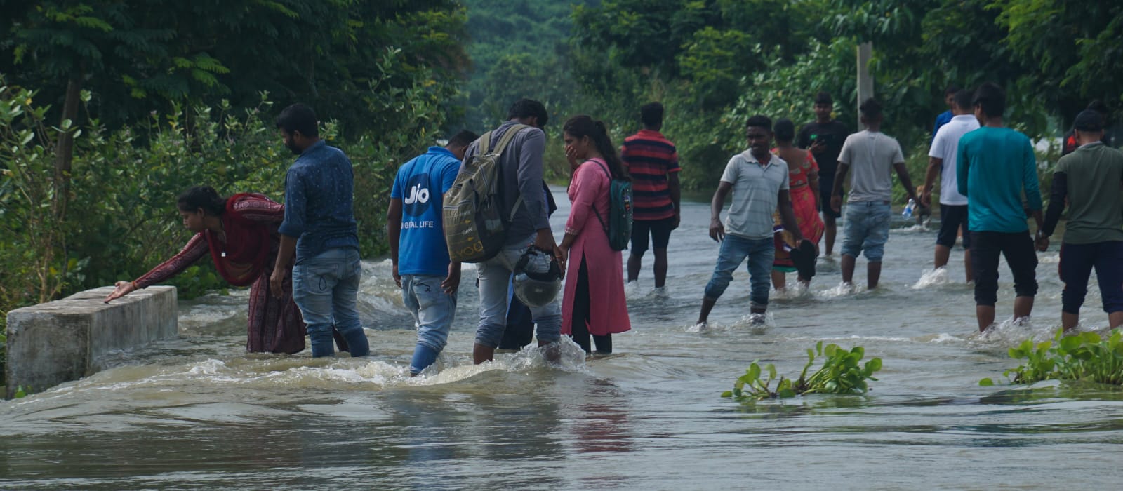 କଟକ ନୂଆପାଟଣାରୁ ଧବଳେଶ୍ୱର ଶୈବପୀଠକୁ ସଂଯୋଗ କରୁଥିବା ରାସ୍ତାରେ ଚାଲୁଥିବା ବନ୍ୟାଜଳରେ ସେଲ୍ଫି ନେଉଛନ୍ତି ଯୁବତୀଯୁବକ