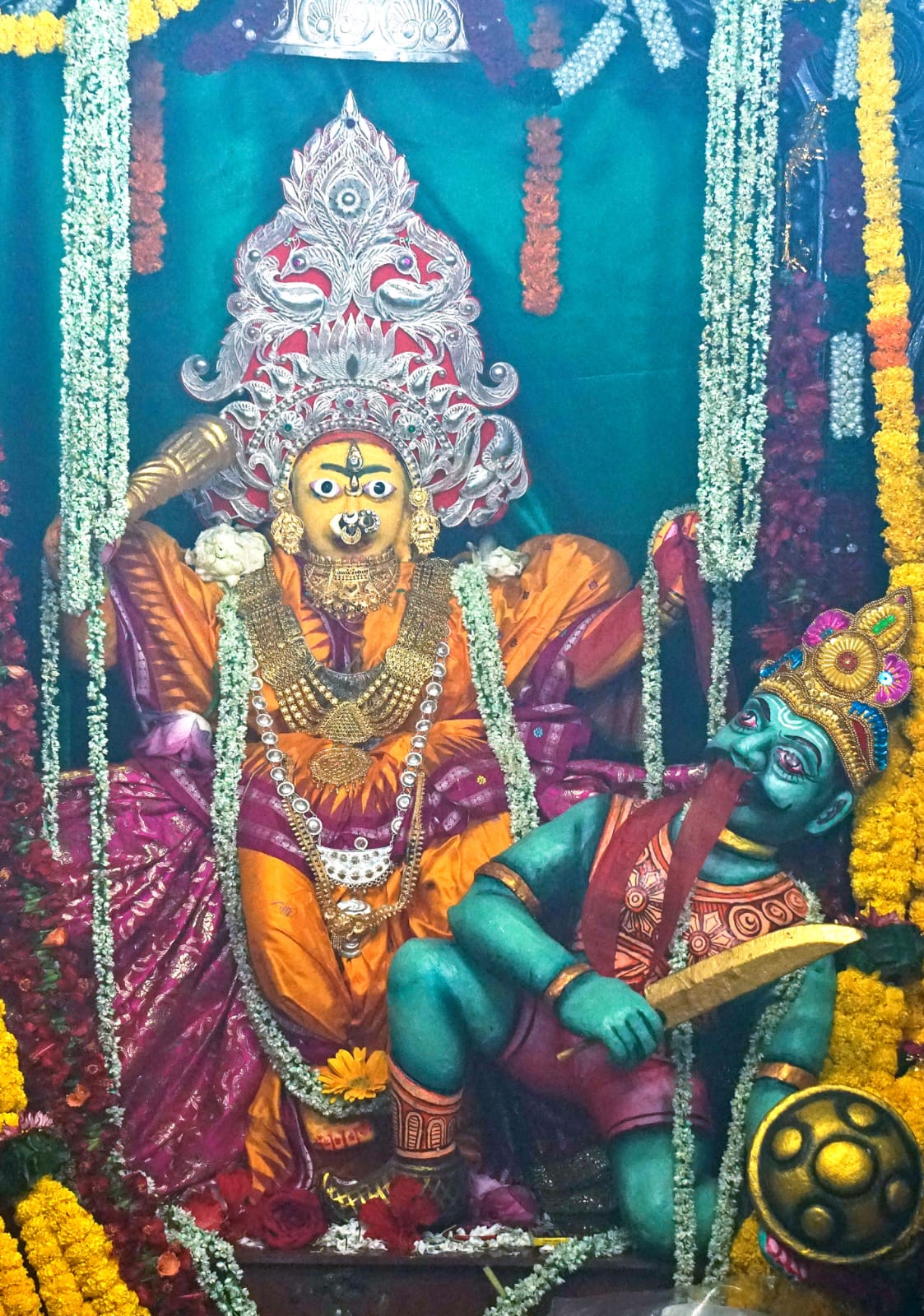 କଟକ ମହମଦିଆ ବଜାର ପୂଜା ମଣ୍ଡପରେ ଶିଳ୍ପୀ ମା ଦୁର୍ଗାଙ୍କ ମୁର୍ମୟୀ ପ୍ରତିମାଙ୍କୁ ଚାନ୍ଦି ଅଳଙ୍କାର ପରିଧାନ କରାଉଛନ୍ତି