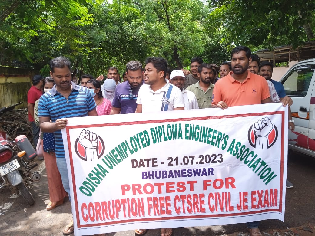ସିଭିଲ ଜେଇ ପରୀକ୍ଷାକୁ ଦୁର୍ନୀତି ମୁକ୍ତ କରିବା ଦାବି ନେଇ ଓଡ଼ିଶା ଅନଏମ୍ପ୍ଲୟଡ ଡିପ୍ଲୋମା ଇଞ୍ଜିନିଅର ଆସୋସିଏସନ ପକ୍ଷରୁ ଭୁବନେଶ୍ୱର ସ୍ଥିତ ଷ୍ଟାଫ ସିଲେକସନ ଅଫିସ ସମ୍ମୁଖରେ ବିକ୍ଷୋଭ ପ୍ରଦର୍ଶନ