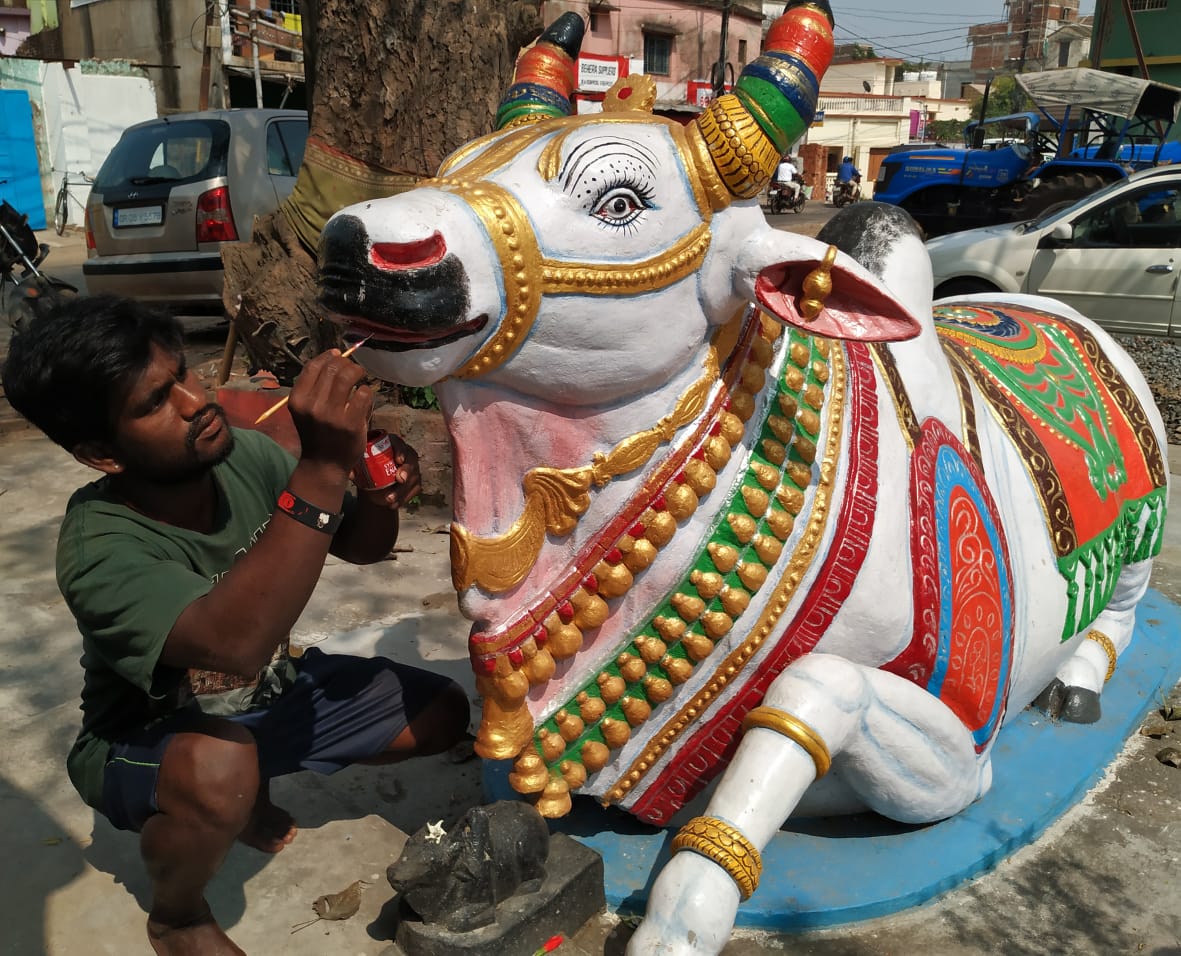 କଟକ ପୁରୀଘାଟ ଭୂତନାଥ ଶିବମନ୍ଦିର ସମ୍ମୁଖ ବୃଷଭ ପ୍ରତିକୃତିରେ ରଙ୍ଗତୂଳୀରେ ନୂତନ ରୂପରେଖ ଦେଉଛନ୍ତି ଶିଳ୍ପୀ