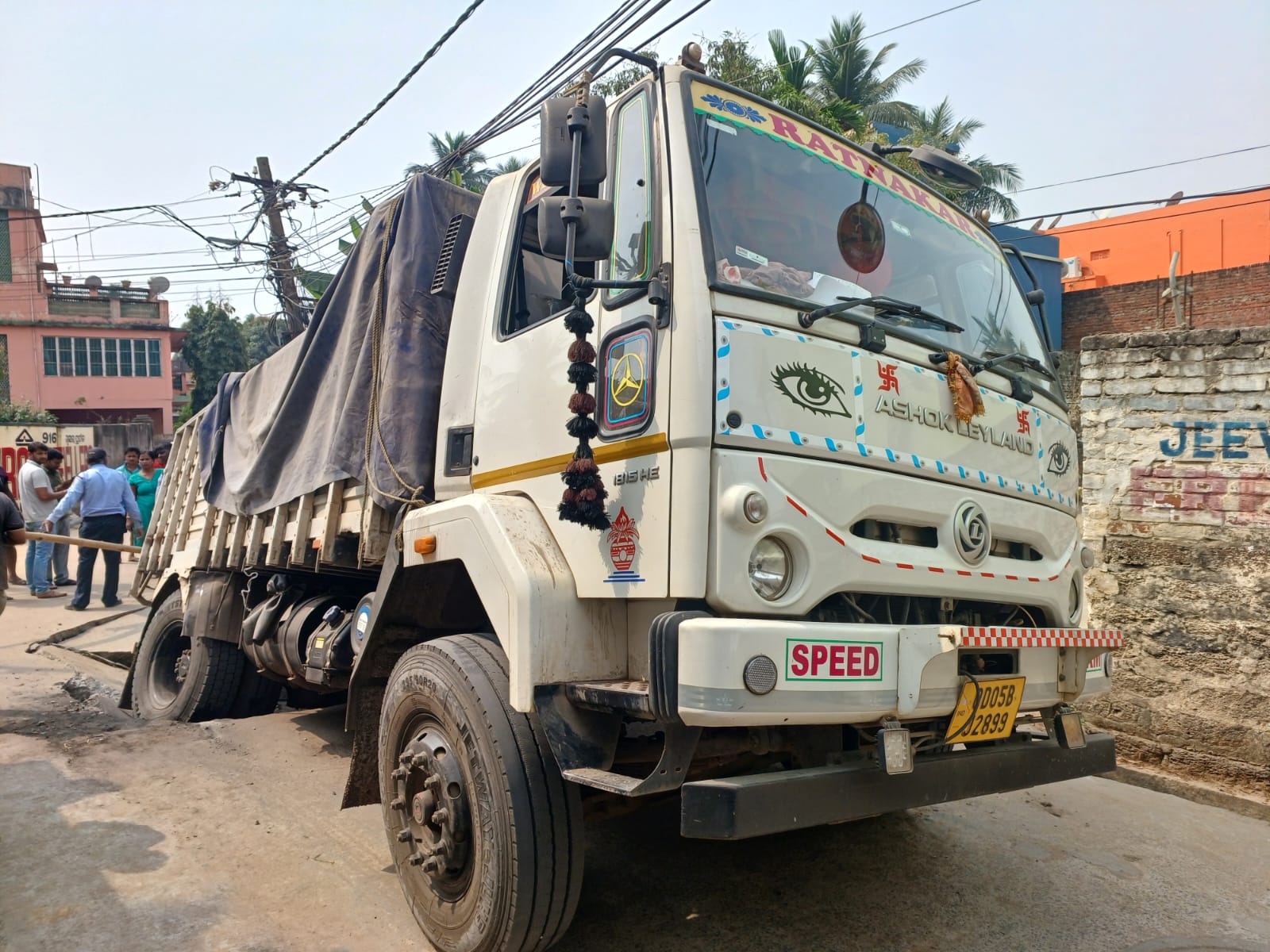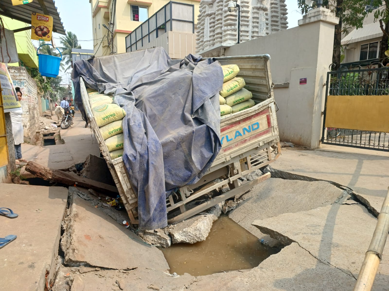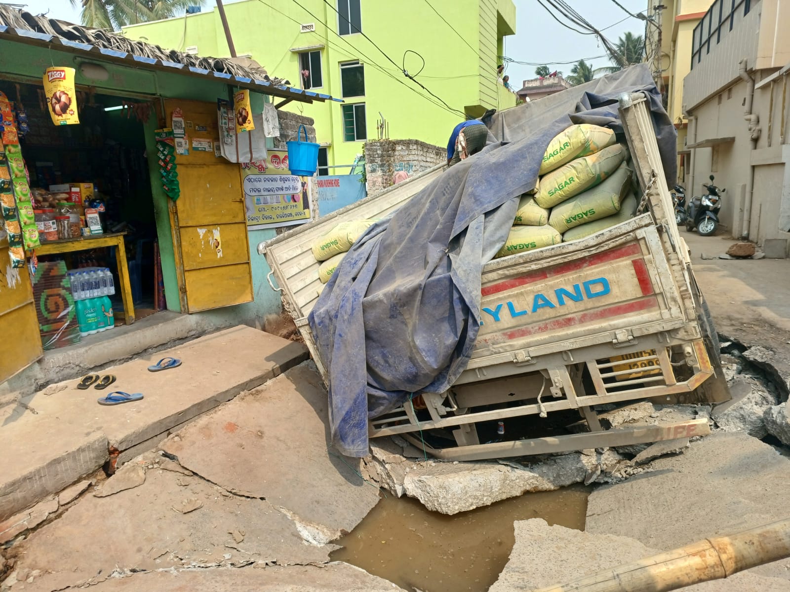 କଟକ ଚାଉଳିଆଗଞ୍ଜ ନୀଳାଦ୍ରି ବିହାର ଅଂଚଳରେ ସିମେଣ୍ଟ ବୋଝେଇ ଟ୍ରକ ଯାଉଥିବା ବେଳେ ରାସ୍ତା ଭୁଶୁଡି ପଡିବା ଫଳରେ ଓଲଟି ପଡିଛି
