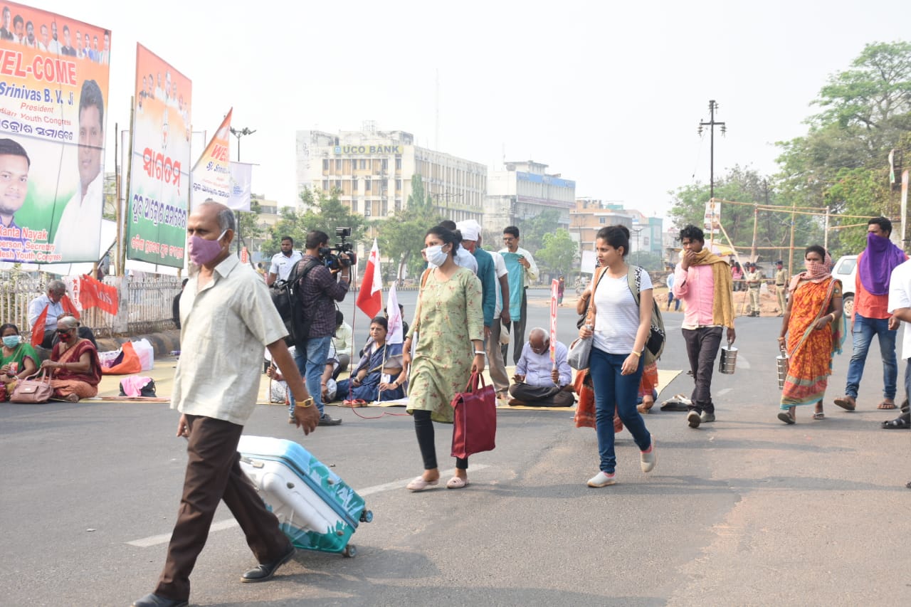 ଭୁବନେଶ୍ୱରରେ ଭାରତ ବନ୍ଦ ସମୟର ଦୃଶ୍ୟ ମାଷ୍ଟର କ୍ୟାଣ୍ଟିନ ଛକରେ ଥିବା ପଥର ଘୋଡା ଉପରେ ଜଣେ ଯୁବକ ବସିଥିବା ସମୟରେ ପୋଲିସ ତାଙ୍କୁ ତଳକୁ ଆସିବାକୁ କହୁଛନ୍ତି କଟକରେ ଭାରତ ବନ୍ଦ ସମୟର ଦୃଶ୍ୟ