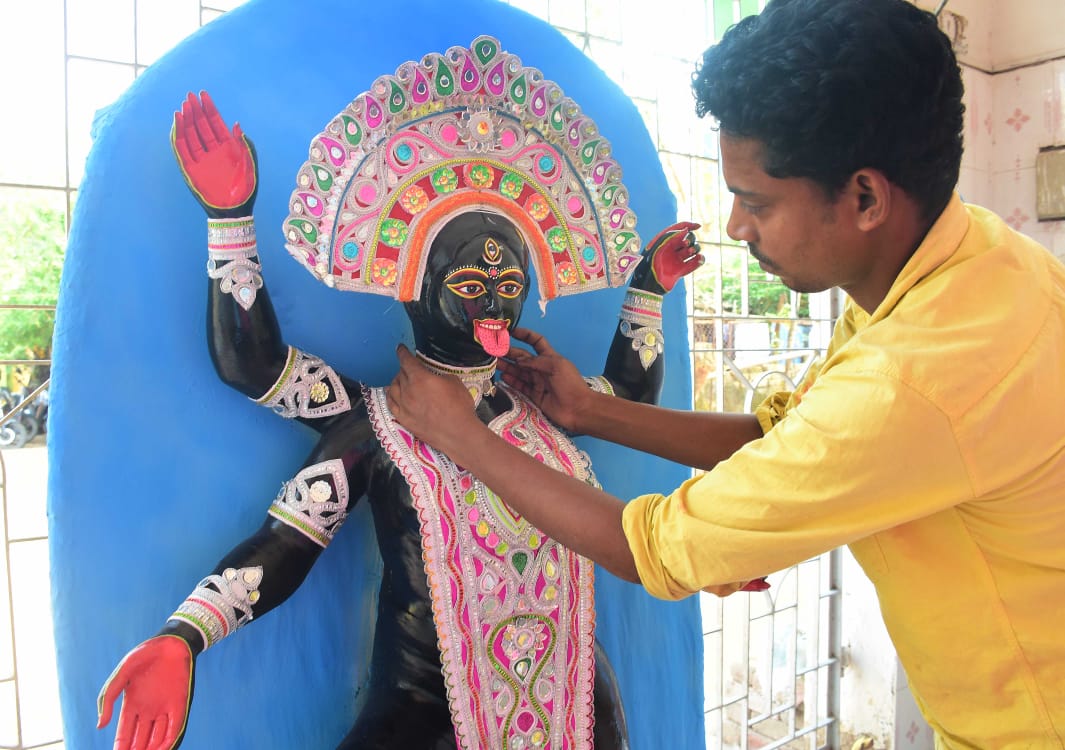 ଭୁବନେଶ୍ୱରର ଏକ ପୂଜାମଣ୍ଡପରେ ମା’କାଳୀଙ୍କ ମୂର୍ତ୍ତିକୁ ଶେଷ ସ୍ପର୍ଶ ଦେଉଛନ୍ତି ଶିଳ୍ପୀ