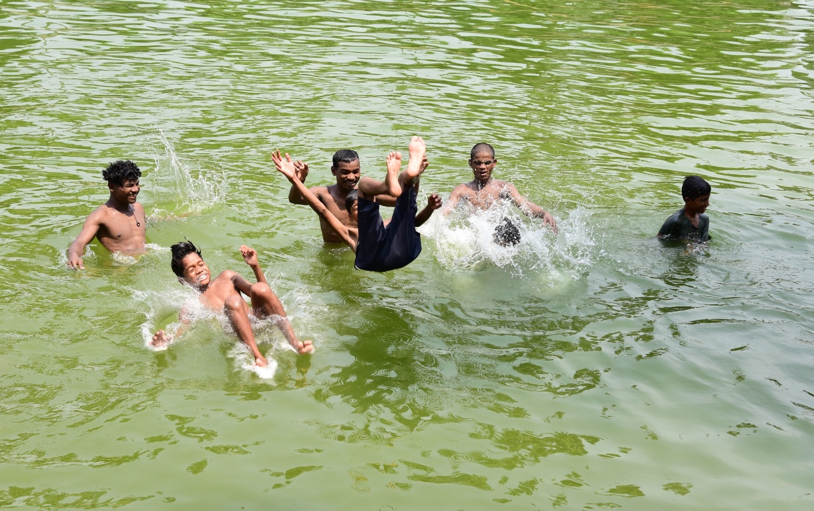 ସୋମବାର ପ୍ରବଳ ଗରମରୁ ରକ୍ଷା ପାଇବାପାଇଁ ପିଲାମାନେ ବରମୁଣ୍ଡା ଠାରେ ଥିବା ଏକ ପୋଖରୀରେ ଏରୋବିକ୍ସ କରୁଛନ୍ତି