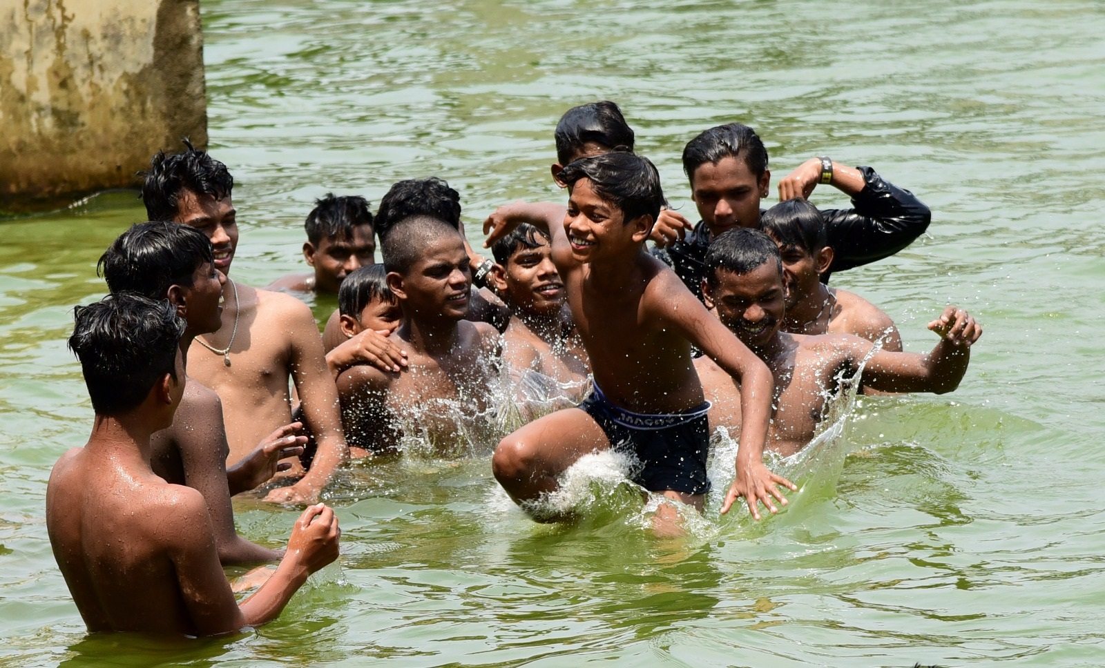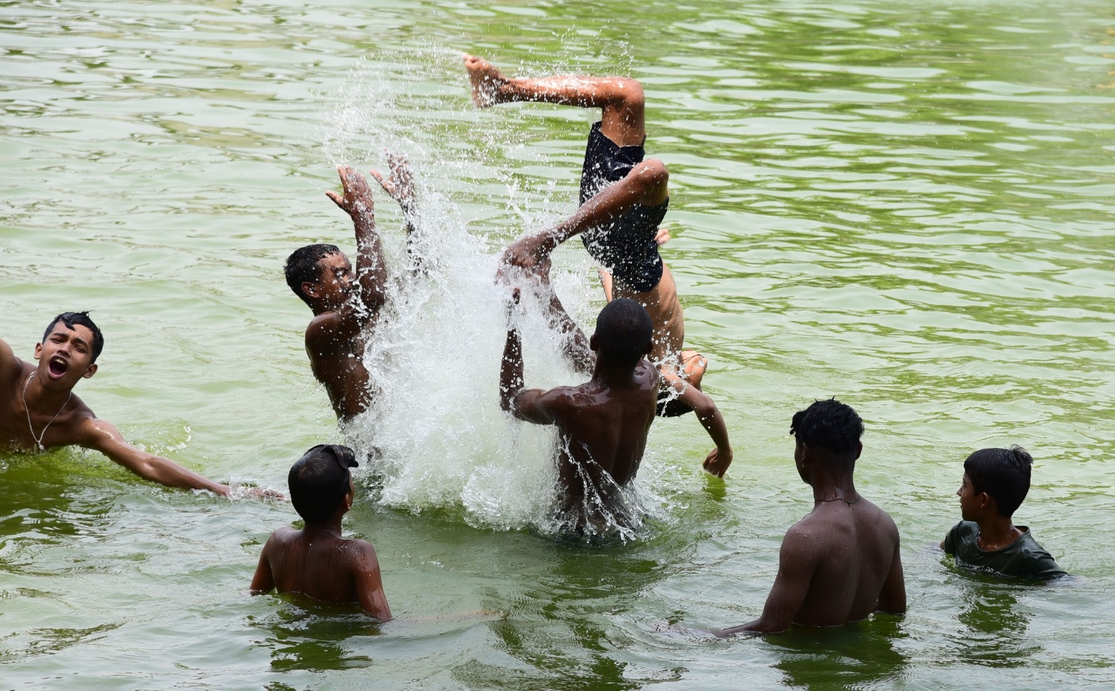 ସୋମବାର ପ୍ରବଳ ଗରମରୁ ରକ୍ଷା ପାଇବାପାଇଁ ପିଲାମାନେ ବରମୁଣ୍ଡା ଠାରେ ଥିବା ଏକ ପୋଖରୀରେ ଏରୋବିକ୍ସ କରୁଛନ୍ତି