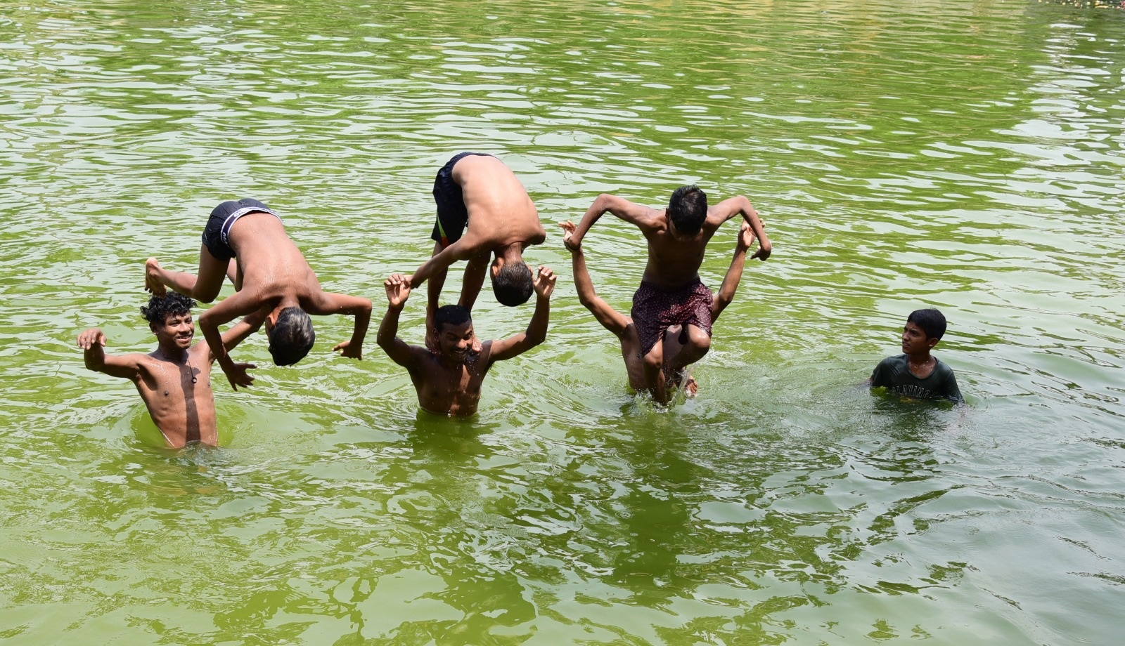 ସୋମବାର ପ୍ରବଳ ଗରମରୁ ରକ୍ଷା ପାଇବାପାଇଁ ପିଲାମାନେ ବରମୁଣ୍ଡା ଠାରେ ଥିବା ଏକ ପୋଖରୀରେ ଏରୋବିକ୍ସ କରୁଛନ୍ତି