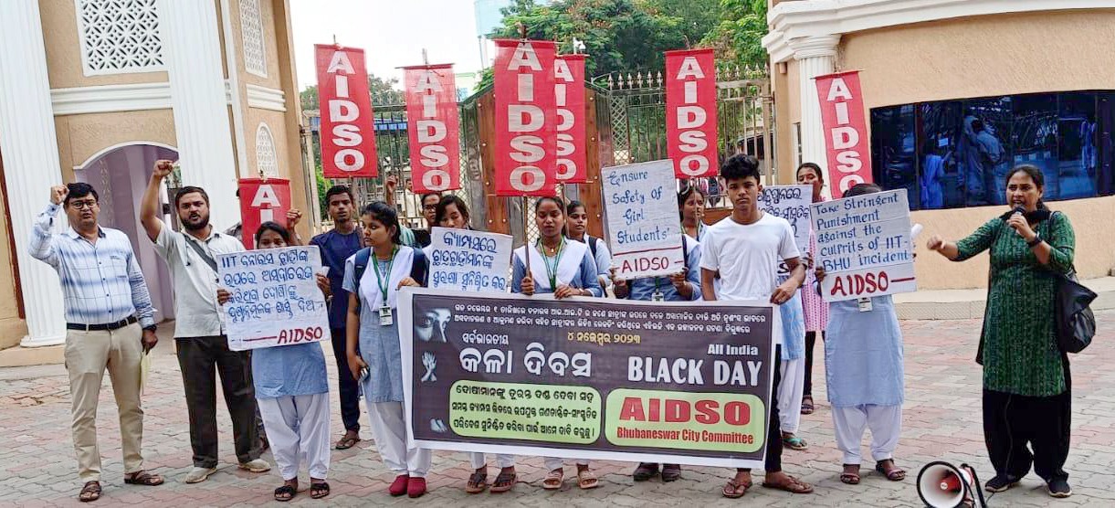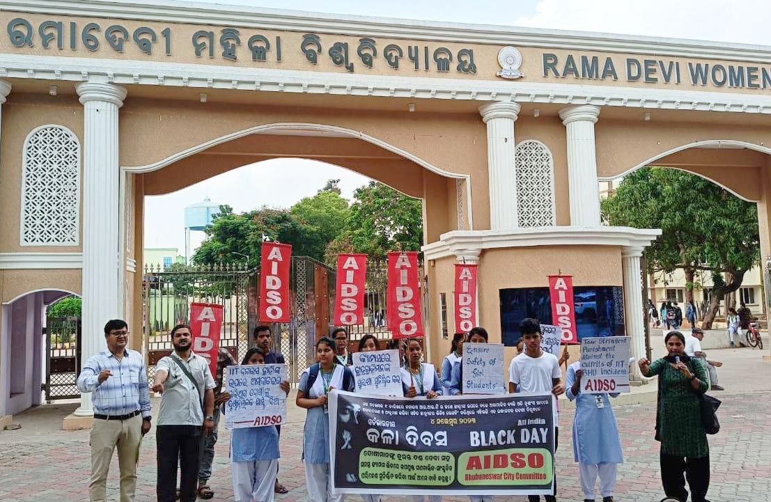 ଆଇଆଇଟି ବନାରସ ଛାତ୍ରୀଙ୍କ ଉପରେ ଅସଦାଚରଣ ବିରୁଦ୍ଧରେ ରମାଦେବୀ ବିଶ୍ୱ ବିଦ୍ୟାଳୟ ସମ୍ମୁଖରେ AIDSO ପକ୍ଷରୁ କଳା ଦିବସ ପାଳିତ