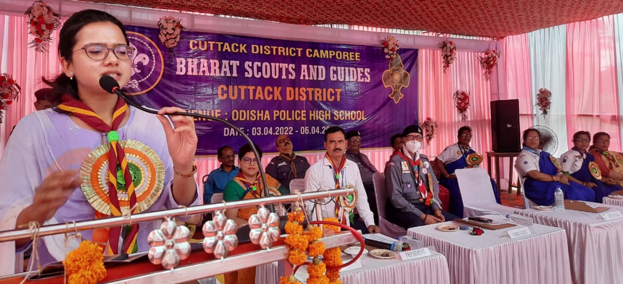 କଟକ ତୁଳସୀପୁରସ୍ଥିତ ଓଡ଼ିଶା ପୋଲିସ ହାଇସ୍କୁଲରେ ଅନୁଷ୍ଠିତ କଟକ ଜିଲା ସ୍କାଉଟ ଓ ଗାଇଡ଼ ଜାତୀୟ ସଂହିତି ଶିବିର ଏବଂ ଜିଲାସ୍ତରୀୟ କ୍ୟାମ୍ପ ଉଦଯାପନୀ ସମାରୋହରେ ସିଏମସି କମିଶନର ଅନନ୍ୟା ଦାସ ବକ୍ତବ୍ୟ ପ୍ରଦାନ କରୁଛନ୍ତି
