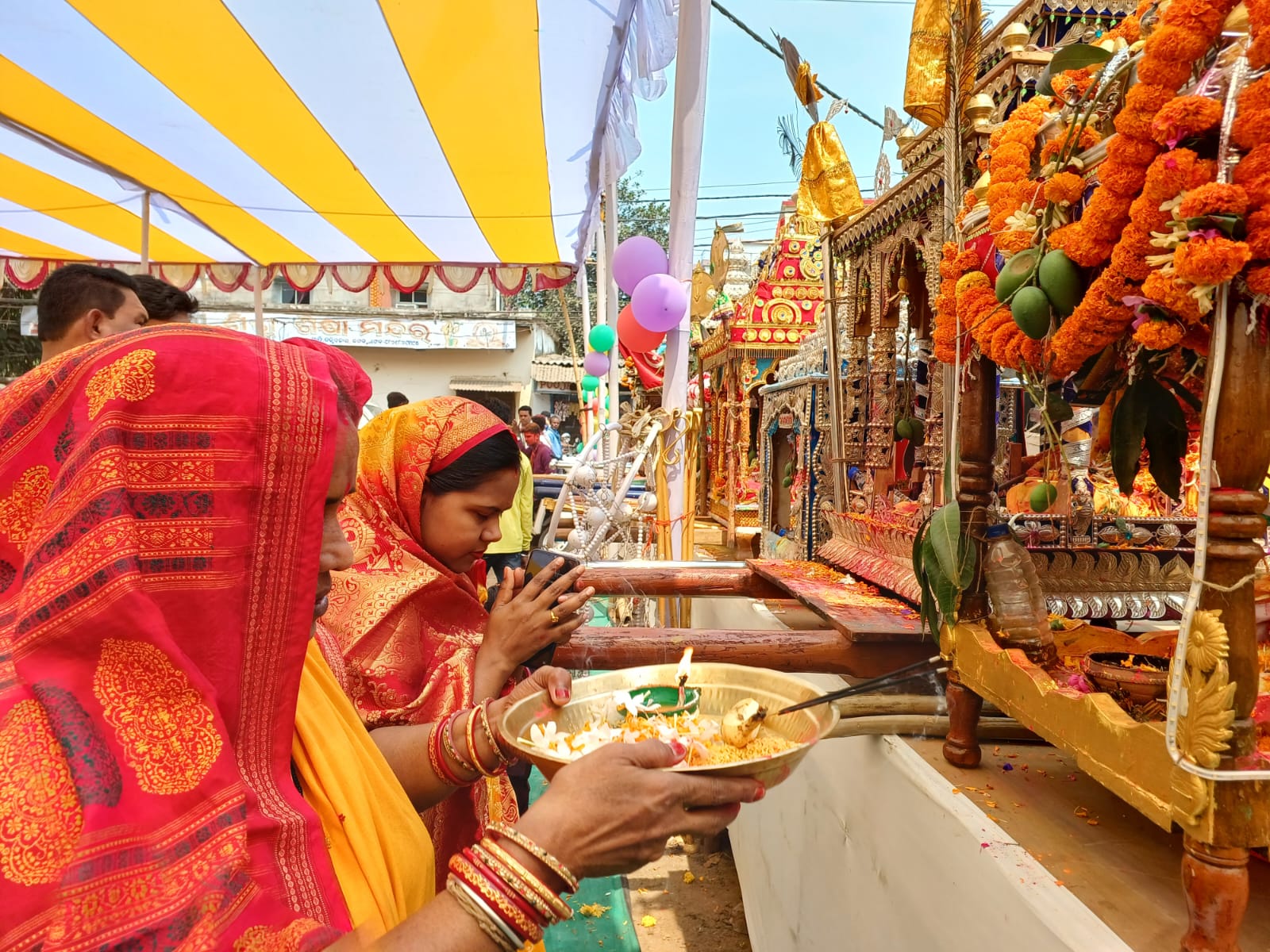 କଟକ ଦୋଳମୁଣ୍ଡାଇ ଚନ୍ଦନ ପଡିଆରୁ ଶୋଭାଯାତ୍ରାରେ ବାହାରି ବକ୍ସିବଜାର ବଢ଼େଇସାହି ବାସ୍ତରୀ ମଠ ମେଳଣ ପଡିଆରେ ପହଞ୍ଚିଥିବା ଦୋଳ ବିମାନ