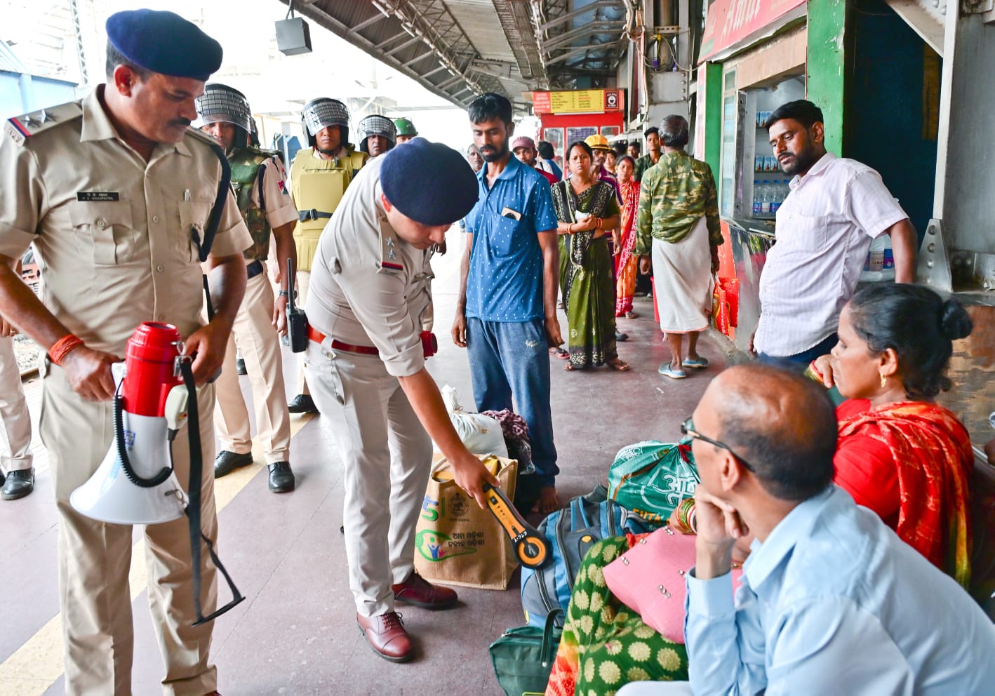 କଟକ ରେଳ ଷ୍ଟେସନରେ ରେଳ ସୁରକ୍ଷା ବାହିନୀ (RPF) କର୍ମଚାରୀମାନେ ଫ୍ଲାଗ ମାର୍ଚ୍ଚ କରୁଛନ୍ତି