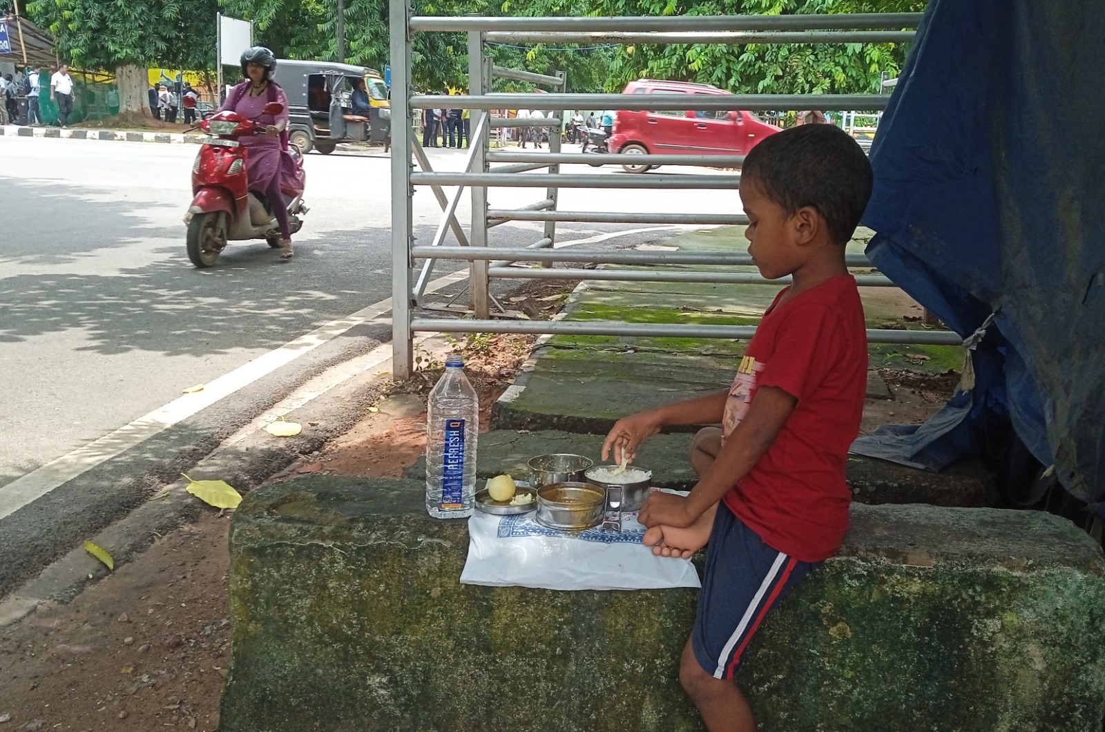 ଭୁବନେଶ୍ୱର ପିଏମଜି ରାସ୍ତା କଡରେ ଜଣେ ଶିଶୁ ଏକ ପିଣ୍ଡି ଉପରେ ବସି ଖାଉଛି