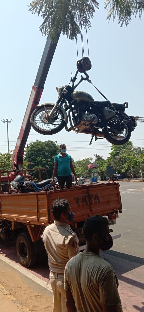 ଭୁବନେଶ୍ୱର ଏଜି ଛକରେ ଆମାନିଆଙ୍କ ମଟରସାଇକେଲକୁ କ୍ରେନ ଦ୍ୱାରା ଉଠାଇ ଥାନାକୁ ନିଆଯାଉଛି