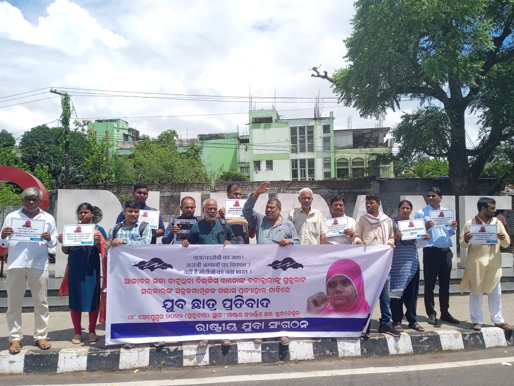 ଆଜୀବନ ସଜା କଟୁଥିବା ବିଲକିସ ବାନୋଙ୍କ ବଲାତ୍କାରୀଙ୍କୁ ଗୁଜୁରାଟ ସରକାରଙ୍କ ଅନୁକମ୍ପାମୂଳକ ଖଲାସ ପ୍ରତ୍ୟାହାର କରିବା ଦାବିରେ ରାଷ୍ଟ୍ରୀୟ ଯୁବ ସଙ୍ଗଠନ ପକ୍ଷରୁ ଭୁବନେଶ୍ୱର ସ୍ଥିତ ମାଷ୍ଟରକ୍ୟାଣ୍ଟିନ ଛକରେ ବିକ୍ଷୋଭ