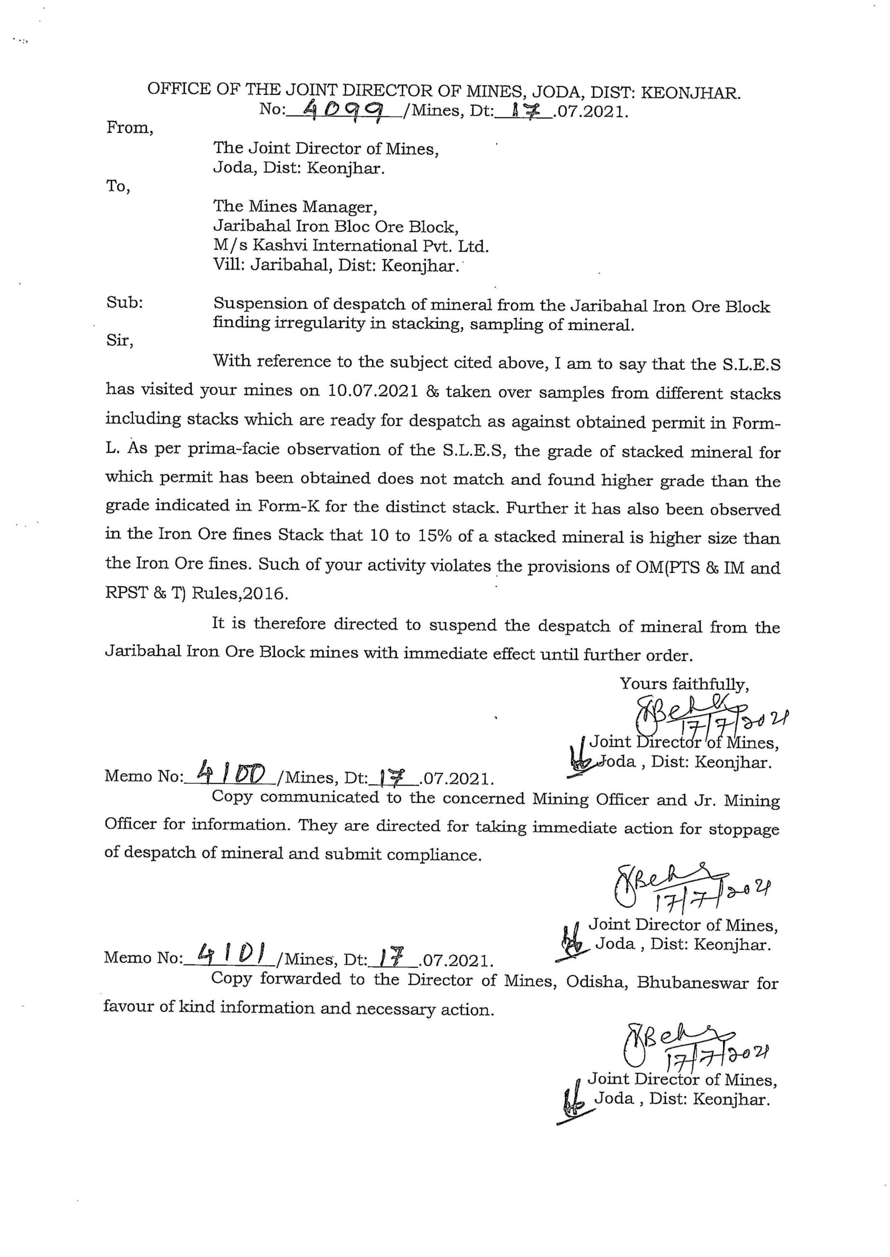 ଯୋଡ଼ା,୨୧।୭(ଡି.ଏନ.ଏ.): ୨୦୨୦ରେ କେନ୍ଦୁଝର ଜିଲା ଖଣି ମଣ୍ଡଳର ଏକାଧିକ ଖଣିକୁ ବିଭିନ୍ନ କମ୍ପାନୀ ନିଲାମ ନେଇଛନ୍ତି। ଏପରି କି କିଛି ଖଣିକୁ ବିକ୍ରି ମୂଲ୍ୟଠାରୁ ଶହେ ପ୍ରତିଶତରୁ ଅଧିକ ମୂଲ୍ୟ ଦେଇ ଏକାଧିକ ବ୍ୟବସାୟୀମାନେ ହାତେଇଛନ୍ତି। ନୂଆ ଭାବେ ନିଲାମ ମାଧ୍ୟମରେ ଲିଜ୍ ପାଇଥିବା କମ୍ପାନୀଗୁଡ଼ିକ ସେମାନଙ୍କ ଖଣିଜ ଉତ୍ତୋଳନ ଆରମ୍ଭ କରିଛନ୍ତି। ତେବେ ନିଲାମ ଡାକରେ ଶହେ ପ୍ରତିଶତଠାରୁ ଅଧିକ ମୂଲ୍ୟ ଦେବେ ବୋଲି ସରକାରଙ୍କଠାରେ ଯେଉଁ ଚୁକ୍ତି କରିଥିଲେ ସେଗୁଡ଼ିକୁ କେତେକ କମ୍ପାନୀ ପୂରଣ କରିବାରେ ସଫଳ ହୋଇପାରୁ ନାହାନ୍ତି। ଫଳରେ ଅଭିନବ ଉପାୟରେ ଉକ୍ତ ଖଣି କମ୍ପାନୀ ଅନିୟମିତତା କରି ଖଣିଜ ପରିବହନ କରୁଥିବା ଜଣାପଡ଼ିଛି। ଏଭଳି ଅନିୟମିତତା ସମ୍ପର୍କରେ ରାଜ୍ୟ ସରକାରଙ୍କ ଖଣି ବିଭାଗର ନଜରକୁ ଆସିବା ପରେ ଗତ ୧୦ତାରିଖରେ ଷ୍ଟେଟ ଲେଭଲ ଏନ୍ଫୋର୍ସମେଣ୍ଟ ସ୍ବାର୍ଡ ଜରିବାହାଲସ୍ଥିତ କାଶ୍ଭି ଖଣିରେ ଯାଞ୍ଚ କରିଥିଲା। ଯାଞ୍ଚ ସମୟରେ ଖଣିଜ ପରିବହନରେ ବ୍ୟାପକ ଅନିୟମିତତା ହୋଇଥିବା ଜଣାପଡ଼ିଛି। ଏନେଇ ସବିଶେଷ ତଥ୍ୟ ପାଇବା ପରେ ଯୋଡ଼ା ଖଣି ଯୁଗ୍ମ ନିର୍ଦ୍ଦେଶକ ସଲିଳ ବେହେରା ପତ୍ର ସଂଖ୍ୟା ୪୦୯୯/ତା୧୭।୭।୨୦୨୧ରେ ଜରିବାହାଲ ଖଣିରୁ ଖଣିଜ ପରିବହନକୁ ବାତିଲ କରିଛନ୍ତି। କାଶ୍ଭି ଖଣିର ଖଣି ପ୍ରବନ୍ଧକଙ୍କୁ ଏନେଇ ପତ୍ର ପଠାଯାଇଛି। ଚିଠିରେ ଉଲ୍ଳେଖ ରହିଛି ଯେ, ଜରିବାହାଲସ୍ଥିତ କାଶ୍ଭି ଖଣିରେ ଅନିୟମିତତା କରାଯାଇ ଖଣିଜ ଷ୍ଟାକ(ଗଚ୍ଛିତ) କରାଯାଇଥିଲା। ଯେଉଁ ଗ୍ରେଡ(ମାନ)ର ଲୁହାପଥର ପରିବହନ ପାଇଁ ଅନୁମୋଦନ ନିଆଯାଇଥିଲା, ତାହାଠାରୁ ଉନ୍ନତମାନର ଲୁହାପଥର ଷ୍ଟାକ୍ରେ ଗଛିତ ରଖାଯାଇଥିଲା। କମ୍ ମୂଲ୍ୟ ଥିବା ଲୁହାପଥର ଗୁଣ୍ଡ ଷ୍ଟାକରେ ଶତକଡ଼ା ୧୦ରୁ ୧୫ ପ୍ରତିଶତ ଅଧିକ ମୂଲ୍ୟ ଥିବା ଉନ୍ନତମାନର ଲୁହାପଥର ରଖାଯାଇଛି, ଯାହାକି ପ୍ରୋଭିଜନ ଅଫ୍ ଓଏମ୍(ପିଟିଏସ୍ ଆଣ୍ଡ ଆଇଏମ୍ ଆଣ୍ଡ ଆରପିଏସ୍ଟି ଆଣ୍ଡ ଟି) ରୁଲ ୨୦୧୬ ର ଉଲ୍ଲଂଘନ ହୋଇଥିବା ଚିଠିରେ ସୂଚନା ଦିଆଯାଇଛି । ଏନେଇ କାଶ୍ଭି ଖଣି ପକ୍ଷରୁ କୌଣସି ମତାମତ ମିଳିପାରି ନାହିଁ।