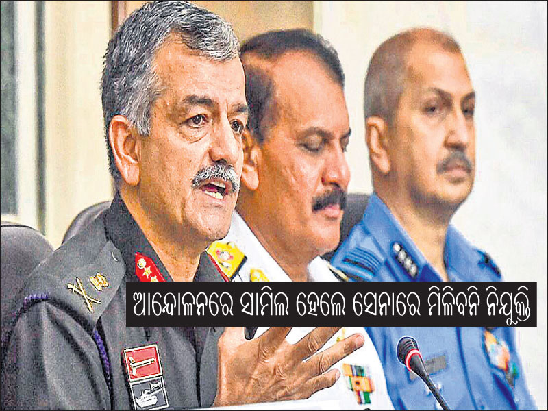ନୂଆଦିଲ୍ଲୀ,୨୦।୬: ସୈନ୍ୟବାହିନୀରେ ଠିକା ନିଯୁକ୍ତି ଯୋଜନା ଅଗ୍ନିପଥକୁ ବିରୋଧ କରି ଦେଶବ୍ୟାପୀ ଆନ୍ଦୋଳନ ଦେଖାଦେବା ପରେ ଏହାକୁ ପ୍ରଶମିତ କରିବା ଲାଗି ସରକାରଙ୍କ ପକ୍ଷରୁ ପ୍ରୟାସ ଜାରି ରହିଛି। ଏଥିସହିତ ଯେଉଁମାନେ ଆନ୍ଦୋଳନରେ ସାମିଲ ହେବେ ସେମାନଙ୍କୁ ସେନାରେ ନିଯୁକ୍ତି ସୁଯୋଗ ମିଳିବ ନାହିଁ ବୋଲି ଏକପ୍ରକାର ଧମକ ମଧ୍ୟ ଦିଆଯାଇଛି।