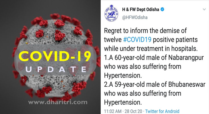 ଭୁବନେଶ୍ୱର,୨୮।୧୦(ବ୍ୟୁରୋ): ରାଜ୍ୟରେ ବୁଧବାର କରୋନା ଆଉ ୧୨ ଜଣଙ୍କ ଜୀବନ ନେଇଛି। ଏଥିସହ ରାଜ୍ୟରେ ମୋଟ ମୃତ୍ୟୁ ସଂଖ୍ୟା ୧୦୮୯କୁ ବୃଦ୍ଧି ହୋଇଛି। ଏ ନେଇ ସ୍ବାସ୍ଥ୍ୟ ଓ ପରିବାର କଲ୍ୟାଣ ବିଭାଗ ପକ୍ଷରୁ ଟୁଇଟ୍‌ ଯୋଗେ ସୂଚନା ଦିଆଯାଇଛି। ୧୨ ମୃତକଙ୍କ ମଧ୍ୟରୁ ଭୁବନେଶ୍ୱରରୁ ୨, ଝାରସୁଗୁଡାରୁ ୨, ନୂଆପଡାରୁ ୨, ନବରଙ୍ଗପୁର, ପୁରୀ, ସୁନ୍ଦରଗଡର, ଗଞ୍ଜାମ, କଟକ, ସମ୍ବଲପୁରରୁ ଜଣେ ଲେଖାଏ ବ୍ୟକ୍ତି ମୃତ୍ୟୁବରଣ କରିଛନ୍ତି।
